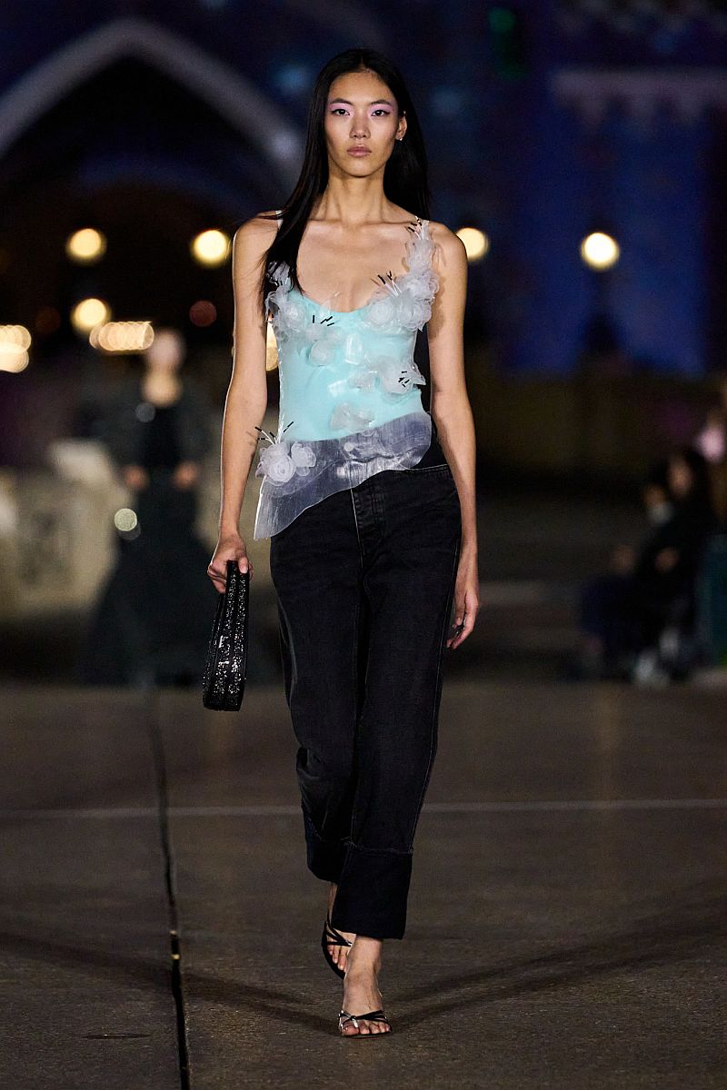 Ο οίκος Coperni παρουσίασε μία party time εμφάνιση παίζοντας με την υφή του παντελονιού: Denim capri, διάφανο τοπ και ψηλοτάκουνα mules.