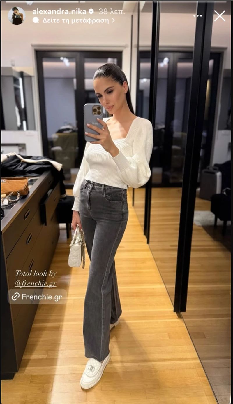 Ξεκινήσαμε από τα αξεσουάρ και αφήσαμε για το τέλος τα ρούχα της. Η Αλεξάνδρα Νίκα επέλεξε ένα γκρι τζιν παντελόνι στη γραμμή flare που έχει επιστρέψει στη μόδα από την προηγούμενη σεζόν και μια λευκή, πλεκτή, κοντή μπλούζα με φουσκωτό μανίκι που έδενε αρμονικά με το casual chic ντύσιμο.