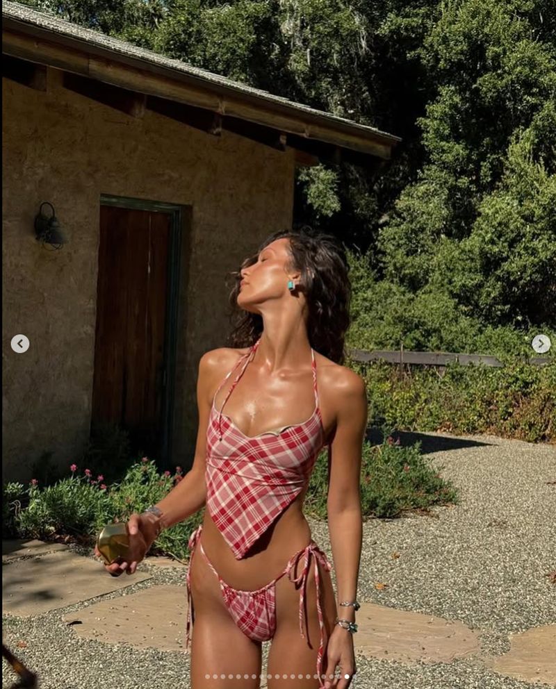 Η αδερφή της Gigi Hadid λοιπόν φόρεσε ένα καρό μπικίνι από τη συνεργασία που έχει με τη μάρκα μαγιό Frankies Bikinis σε ένα σχέδιο που έγινε δημοφιλές στις αρχές της δεκαετίας του 2000 αλλά δεν κράτησε πολύ και έκτοτε δεν το έχουμε δει να επανέρχεται μέχρι στιγμής τουλάχιστον στη μόδα. Το πάνω μέρος του μαγιό μοιάζει περισσότερο με τοπ που έχει σχήμα μαντηλιού με τη μυτερή άκρη να πέφτει προς τα κάτω, ενώ το κάτω μέρος του δένει με κορδόνια στα πλάγια. Η Βella ολοκλήρωσε το look της με ένα ζευγάρι σκουλαρίκια που έφεραν τυρκουάζ πέτρες και ασημένια chunky βραχιόλια.