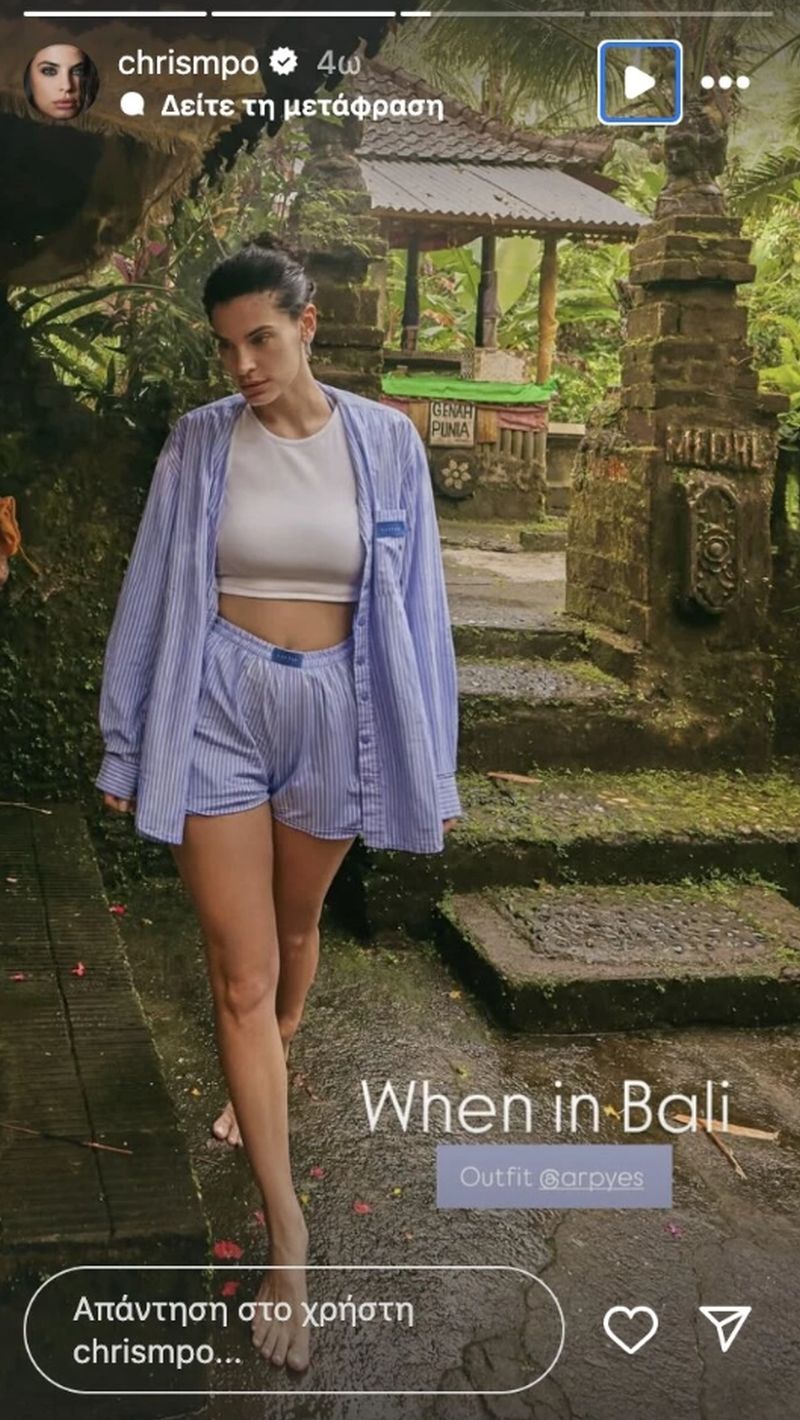 Η Χριστίνα Μπόμπα έκανε πρόσφατα ένα ταξίδι στο Μπαλί και ανάμεσα στις εμφανίσεις της φόρεσε και ένα two piece σύνολο που αποτελείται από μακρυμάνικο πουκάμισο και boxer shorts σε γαλάζιο χρώμα με μοτίβο κάθετη λευκή ρίγα από την ελληνική εταιρία Arpyes που παραπέμπει σε pyjama look.