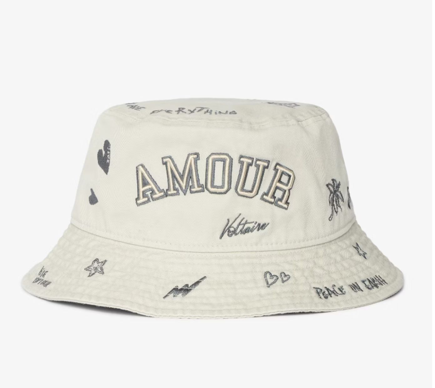 Καπέλο Bucket: Επίσης από βαμβάκι, φέρει την επιγραφή «Amour» στο μπροστινό μέρος, το λογότυπο της Zadig & Voltaire στο πλάι και το σύνθημα «Unlimited Love» στο κάτω μέρος του γείσου.