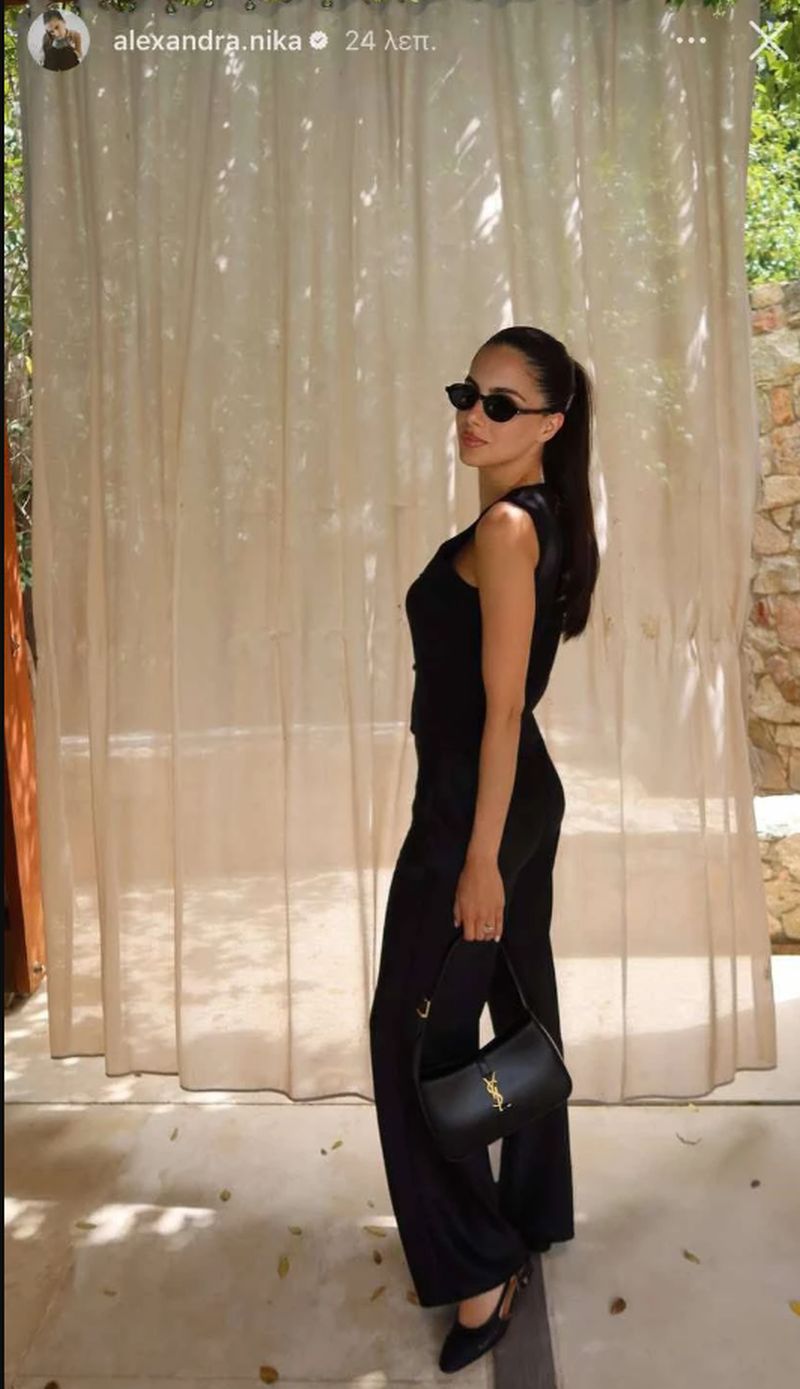Η τσάντα που κρατά η Αλεξάνδρα Νίκα είναι το σχέδιο le 5 à 7 από τον οίκο Saint Laurent και κοστίζει 2000 ευρώ. Η Le 5 à 7 του οίκου Saint Laurent είναι μία από τις πιο χαρακτηριστικές και περιζήτητες τσάντες του brand τα τελευταία χρόνια. Ονομάστηκε έτσι εμπνευσμένη από την παριζιάνικη φράση “le cinq à sept” – το διάστημα 5 με 7 το απόγευμα, που συμβολίζει την ώρα του απογευματινού cocktail ή της «μυστικής συνάντησης. » Είναι μια τσάντα με attitude, αλλά και πρακτική για city chic εμφανίσεις. Είναι διαχρονικά κομψή, χωρίς να κραυγάζει logo κάτι που την κάνει ιδιαίτερα δημοφιλή. Φοριέται από fashion insiders και celebrities όπως η Zoë Kravitz, η Hailey Bieber, και η Rosie Huntington-Whiteley. Είναι ένα τέλειο κομμάτι day-to-night — από το γραφείο μέχρι το dinner date. Κάτι ξέρει η Αλεξάνδρα.