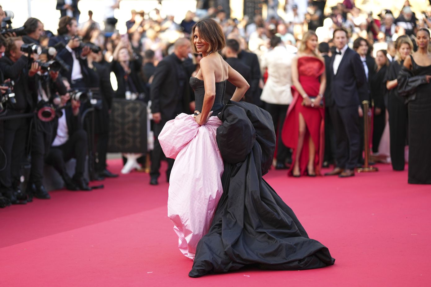 Για την περίσταση, η Halle Berry επέλεξε ένα εντυπωσιακό strapless φόρεμα από τη συλλογή της Celia Kritharioti για την Άνοιξη 2025, το οποίο αποτελείται από ένα μαύρο κορσέ και μία φούστα με έντονους όγκους σε μαύρο και ροζ χρώμα με καρό μοτίβο. Το συγκεκριμένο φόρεμα το είδαμε στην επίδειξη της Ελληνίδας σχεδιάστριας που έγινε στο Παρίσι πριν από λίγες εβδομάδες και το show άνοιξε η Irina Shayk.