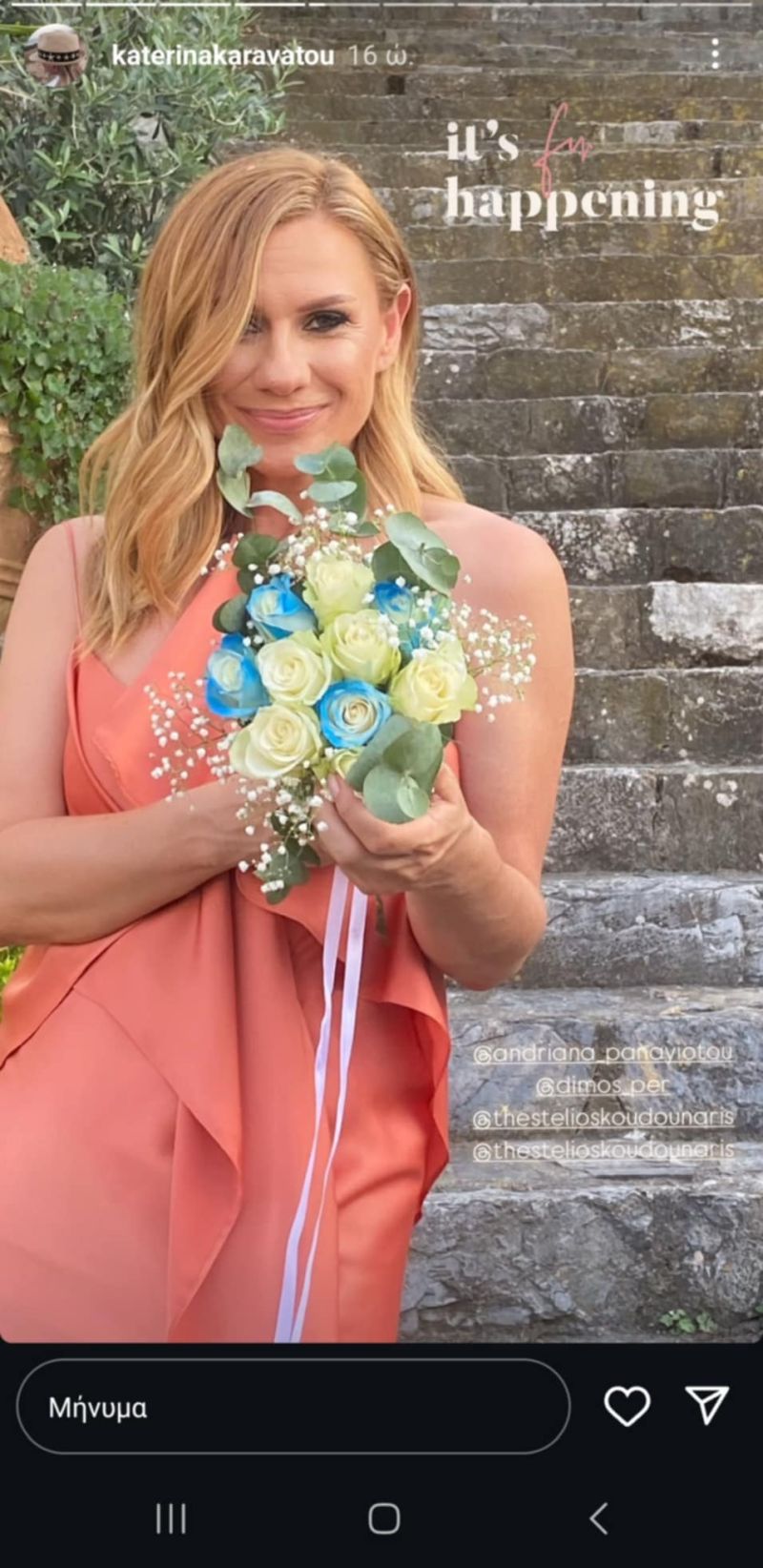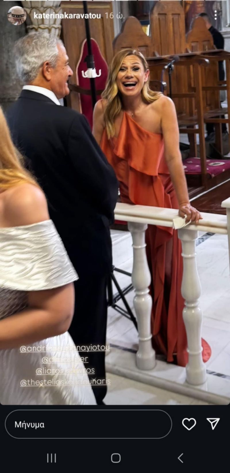 H Kατερίνα Καραβάτου έγινε κουμπάρα και επέλεξε για το μυστήριο ένα φόρεμα από τη νέα συλλογή SS2025 του φίλου και συνεργάτη της στην εκπομπή «My Style Rocks» σχεδιαστή Στέλιου Κουδουνάρη. Πρόκειται για ένα θηλυκό μάξι φόρεμα με αιθέρια γραμμή και αρκετά βολάν σε πορτοκαλί-κεραμιδί απόχρωση, το οποίο έπεφτε ανάλαφρα στη σιλουέτα δημιουργώντας μια αιθέρια αίσθηση κίνησης.