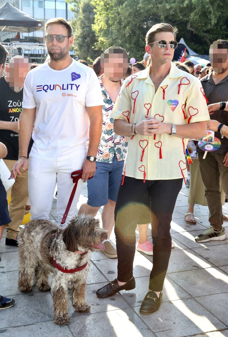 Ο Στέφανος Κασσελάκης και ο σύζυγός του, Τάιλερ ΜακΜπέθ, βρέθηκαν το Σάββατο στην Πλατεία Συντάγματος για να λάβουν μέρος στο φετινό Gay Pride μαζί με το σκυλάκι της οικογένειας, τη Φάρλι. Ο Στέφανος Κασσελάκης επέλεξε ένα λευκό T-Shirt του Κόμματός του, Κίνημα Δημοκρατίας, που πάνω έγραφε τη λέξη «Εquality», δηλαδή ισότητα, το οποίο συνδύασε με λευκό παντελόνι και ο Τάιλερ ΜακΜπέθ ένα πουκάμισο στο star colour της σεζόν που είναι το butter yellow και πάνω είχε ραμμένες κόκκινες καρδιές το οποίο και συνδύασε με ένα παντελόνι σε σκούρα απόχρωση. Kαι οι δυο ολοκλήρωσαν τα looks τους με γυαλιά ηλίου και ρολόγια χειρός, ενώ φυσικά φορούσαν τις βέρες τους.