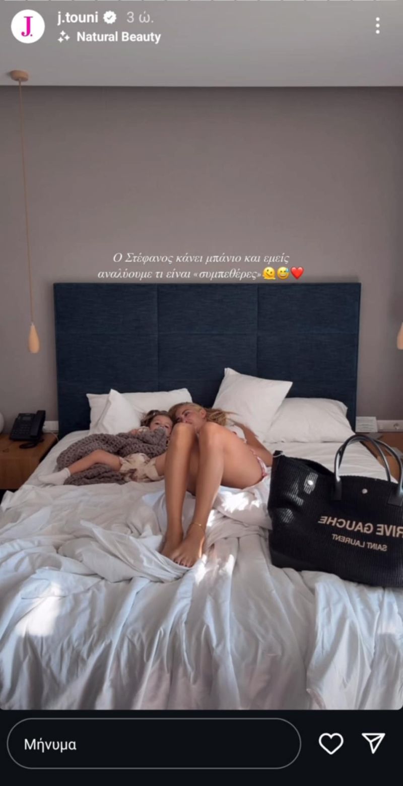 Η Ιωάννα Τούνη βρίσκεται για διακοπές στην Κέρκυρα μαζί με το γιο της Πάρη και τους φίλους της και ανέβασε ένα story στον προσωπικό της λογαριασμό στο Instagram στο οποίο είναι ξαπλωμένη μαζί με το μικρό στο κρεβάτι και του εξηγεί τι σημαίνει η λέξη «συμπεθέρες» καθώς έτσι αποκαλεί τις ακολούθους της με το γιο της να καταλαβαίνει την έννοια της αγαπημένης λέξης της μαμάς του.