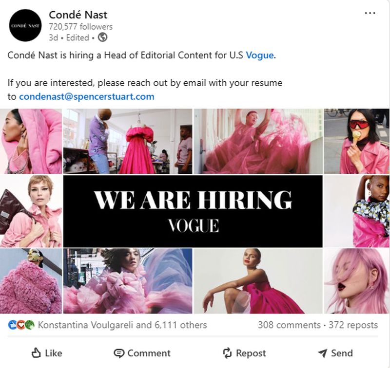 H Anna Wintour αποχώρησε από την διεύθυνση της Αμερικανικής Vogue στις 26 Ιουνίου και η μητρική εταιρεία του περιοδικού, η Condé Nast λίγες ημέρες μετά την ανακοίνωση έβαλε αγγελία για τη θέση της στο LinkedIn δημιουργώντας προσδοκίες σε όσους και όσες ονειρεύονται τέτοια καριέρα στη μόδα.