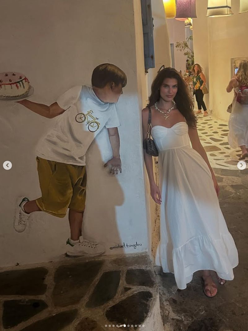 Μία από τις πιο εντυπωσιακές εμφανίσεις της ήταν μπροστά στο γνωστό έργο street art του Μιχάλη Τσινόγλου -το αγόρι με την τούρτα- που έχει γίνει σημείο αναφοράς για φωτογραφίες στη Νάξο. Εκεί, η Ανθή φόρεσε το απόλυτο λευκό boho φόρεμα του καλοκαιριού. Είναι μακρύ, αέρινο και με μπούστο τύπου structured cups που αγκαλιάζει το στήθος και χαρίζει σχήμα, ενώ η φούστα ανοίγει σε γραμμή Α με διακριτικό βολάν στο τελείωμα. Το λευκό χρώμα, κλασικό σύμβολο του καλοκαιριού, αναδεικνύει την ηλιοκαμένη επιδερμίδα και ταιριάζει απόλυτα με το γαλάζιο των Κυκλάδων.
