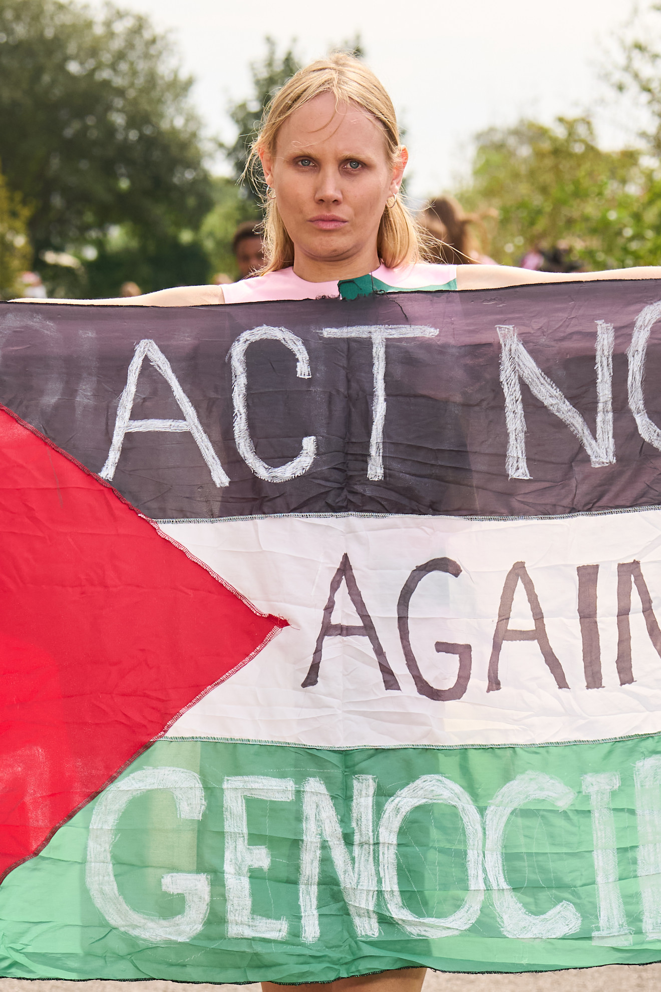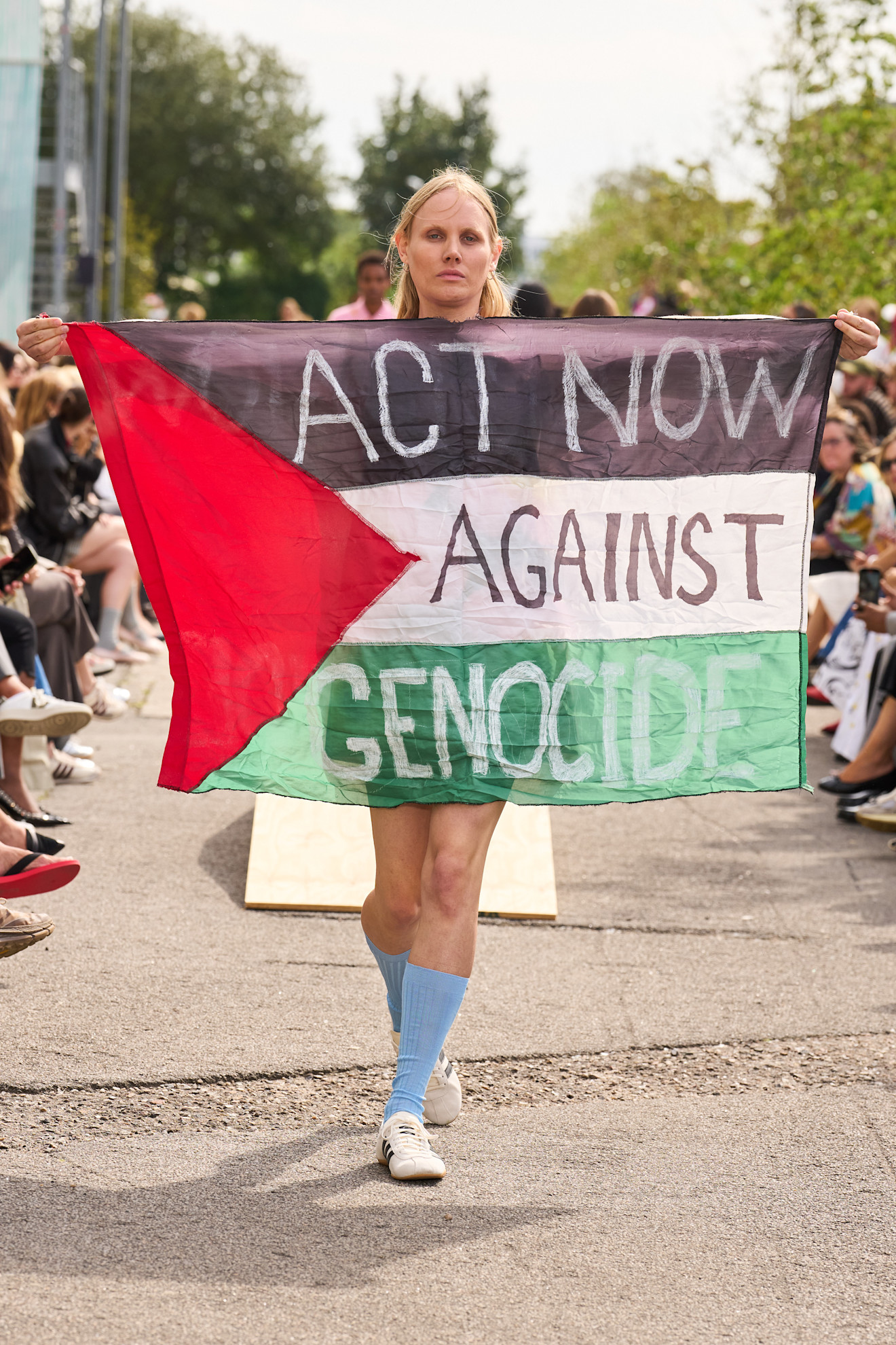 Η επίδειξη παρουσίαζε τη συλλογή Άνοιξη/Καλοκαίρι 2026, σε ένα σκηνικό με βιομηχανική αισθητική κοντά στο λιμάνι της Κοπεγχάγης. Τα μοντέλα περπατούσαν ανάμεσα σε πολύχρωμα, φλοράλ prints, ώσπου η Jura εμφανίστηκε φορώντας ένα φόρεμα του brand. Στη μέση του catwalk, έβγαλε από την τσέπη της μια παλαιστινιακή σημαία, την άνοιξε και την κράτησε ψηλά. Επάνω της υπήρχε το μήνυμα: «Δράστε τώρα κατά της γενοκτονίας». Η αντίδραση του brand ήταν άμεση. Μετά το τέλος του περάσματός της, η ασφάλεια την συνόδευσε εκτός του χώρου της επίδειξης. Ωστόσο, η εικόνα της είχε ήδη κάνει τον γύρο των social media και των διεθνών μέσων.