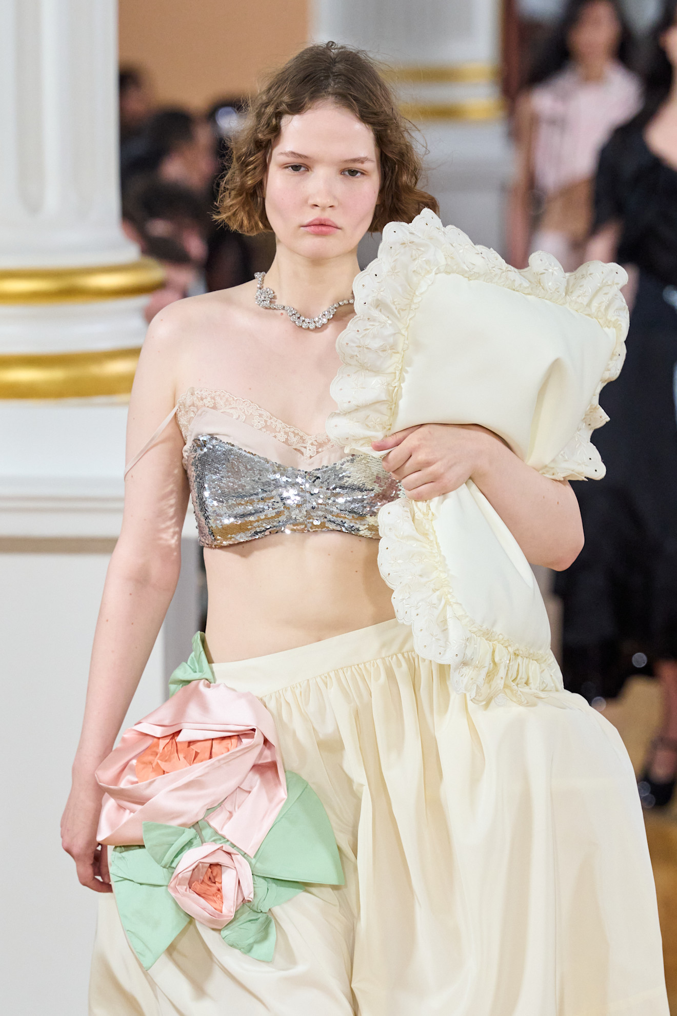 Η Simone Rocha δεν έμεινε φυσικά μόνο στις τσάντες-μαξιλάρια. Στη συλλογή της είδαμε επίσης 3D λουλούδια σε σχήμα κρίνου, που στόλισαν φορέματα και πανωφόρια, τα ανατρεπτικά platform Mary Janes σε συνεργασία με την Crocs, και ένα έντονο lip statement στο μακιγιάζ, σε συνεργασία με τον make-up artist Thomas De Kluyver. Όλα αυτά έδειξαν για ακόμα μία φορά πώς η σχεδιάστρια αγαπά να πειραματίζεται με τις λεπτομέρειες που κάνουν ένα σύνολο να ξεχωρίζει, όπως μόνο αυτή ξέρει.