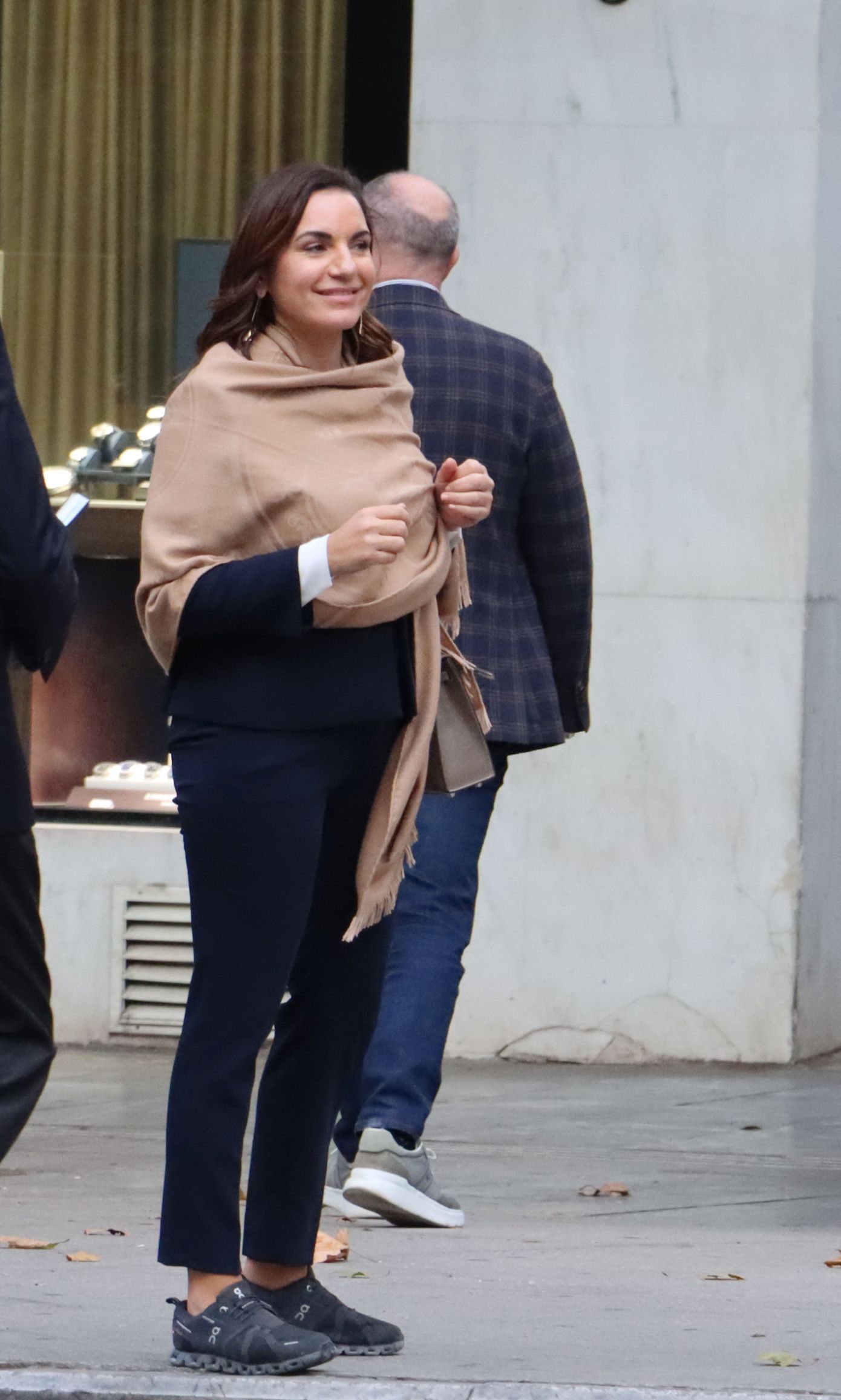Για να «σπάσει» τη σοβαρότητα του κοστουμιού, πρόσθεσε μια μπεζ πασμίνα, φορεμένη γύρω από το στήθος, καθώς και μια γκρι τσάντα σε λιτές γραμμές. Το στοιχείο όμως που έκανε τη διαφορά ήταν τα sneakers της. Επέλεξε ένα ζευγάρι σε marble blue απόχρωση, ένα μπλε με γκρι υποτόνους που δένει αρμονικά με το υπόλοιπο σύνολο και διατηρεί το look ισορροπημένο.