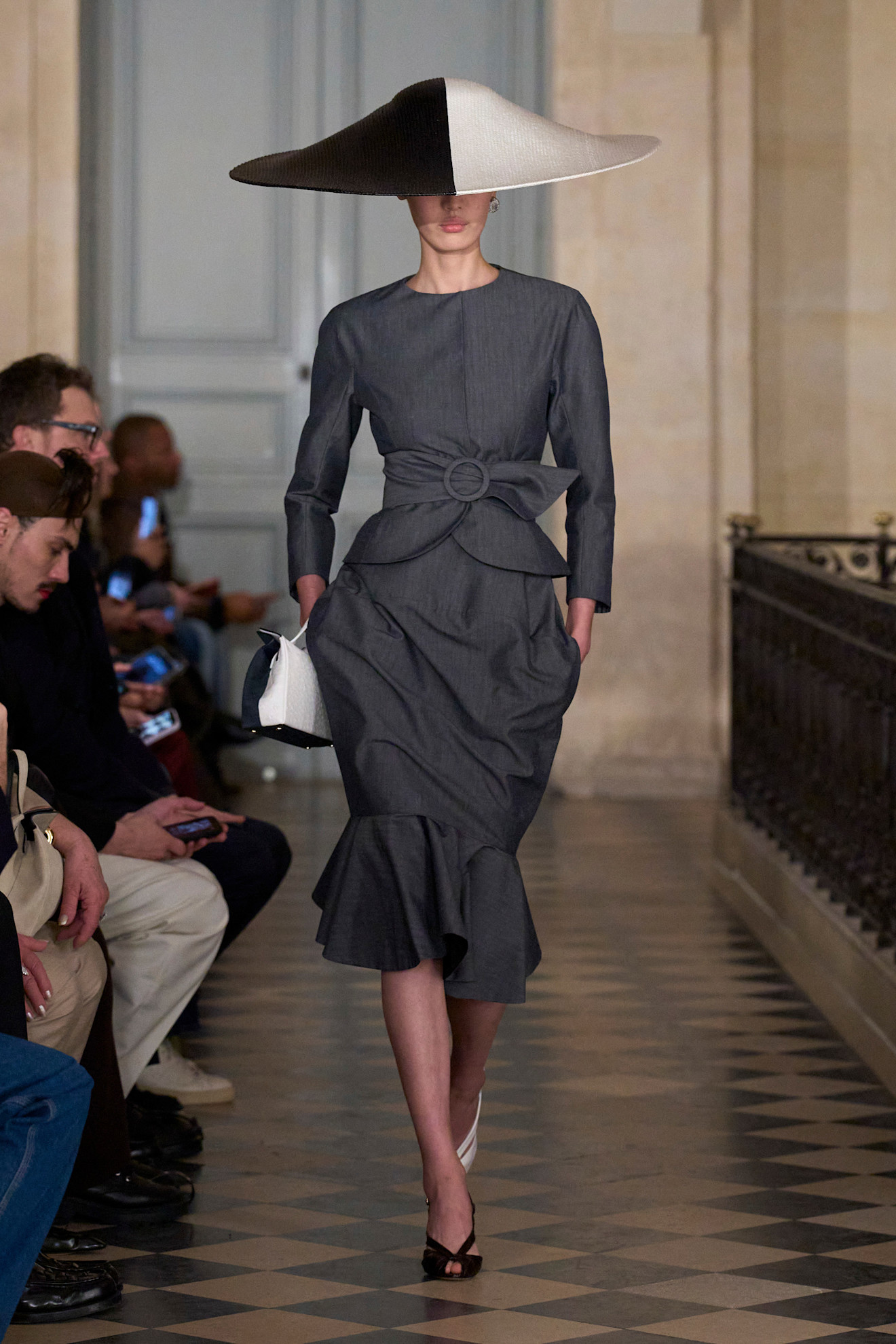 Από την πρώτη στιγμή, η ατμόσφαιρα θύμιζε soirée άλλης εποχής. Οι καλεσμένοι έμοιαζαν σαν να είχαν έρθει κατευθείαν από κάποιο private party του Παρισιού, ενώ τα μοντέλα εμφανίστηκαν με το χαρακτηριστικό palmier hairstyle, ένα ιδιαίτερο ponytail που κάποτε θεωρούνταν σήμα κατατεθέν των πιο fashionable κύκλων της πόλης. Το χτένισμα έδωσε αμέσως τον τόνο: ρετρό διάθεση, υπερβολή και μια δόση αυτοσαρκασμού.