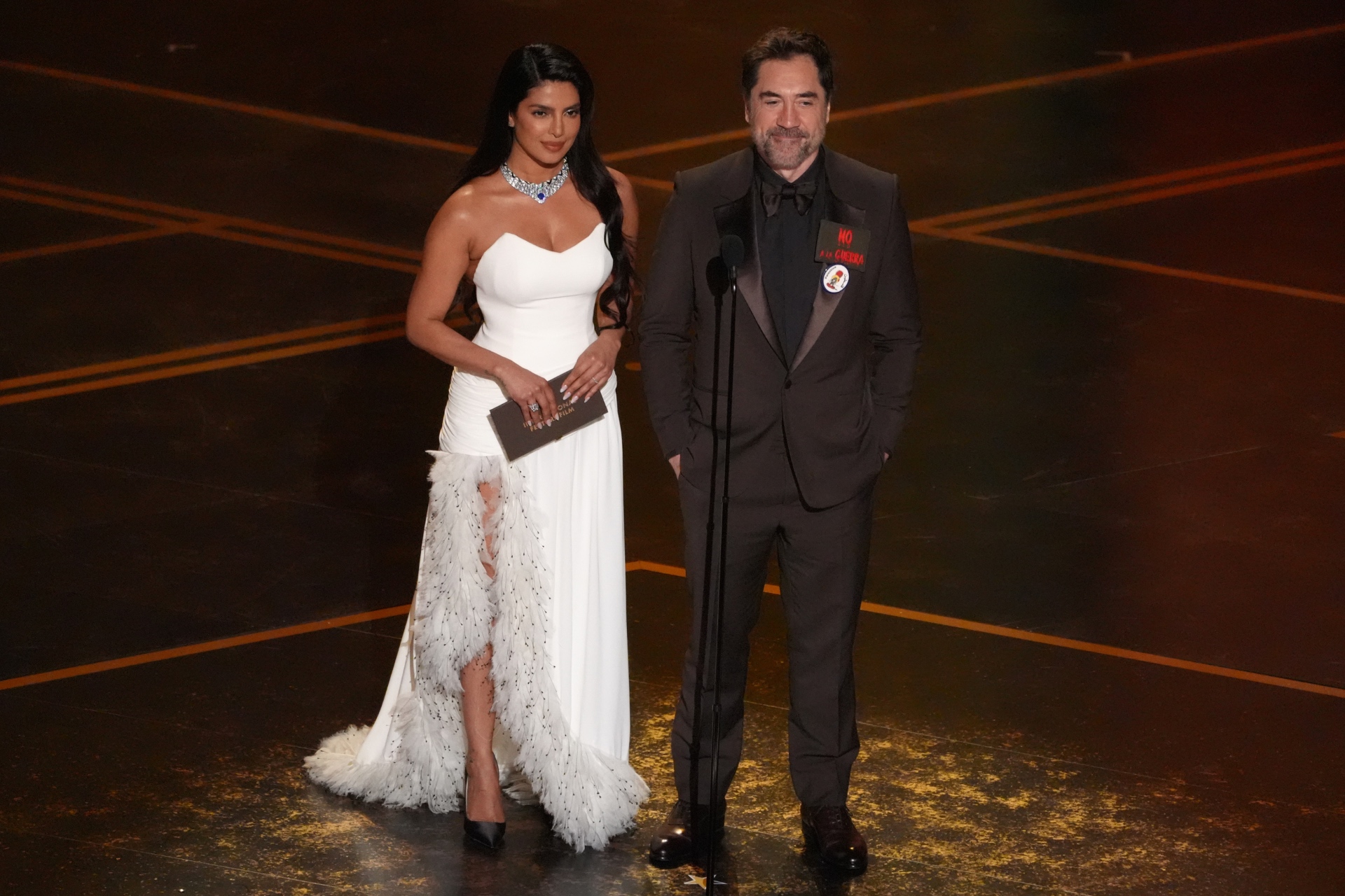 Η Priyanka Chopra Jonas επέλεξε μια εντυπωσιακή δημιουργία Dior, η οποία συνδύαζε παλιό Hollywood glamour με σύγχρονη αισθητική. Το λευκό strapless φόρεμα είχε εφαρμοστή γραμμή, βαθύ σκίσιμο στο πόδι και φτερωτές λεπτομέρειες που δημιουργούσαν μια δραματική κίνηση καθώς περπατούσε. Το look ολοκληρώθηκε με statement διαμαντένιο κολιέ και σκουλαρίκια, ενώ τα μαύρα ψηλοτάκουνα παπούτσια έδιναν μια έντονη αντίθεση στο σύνολο.