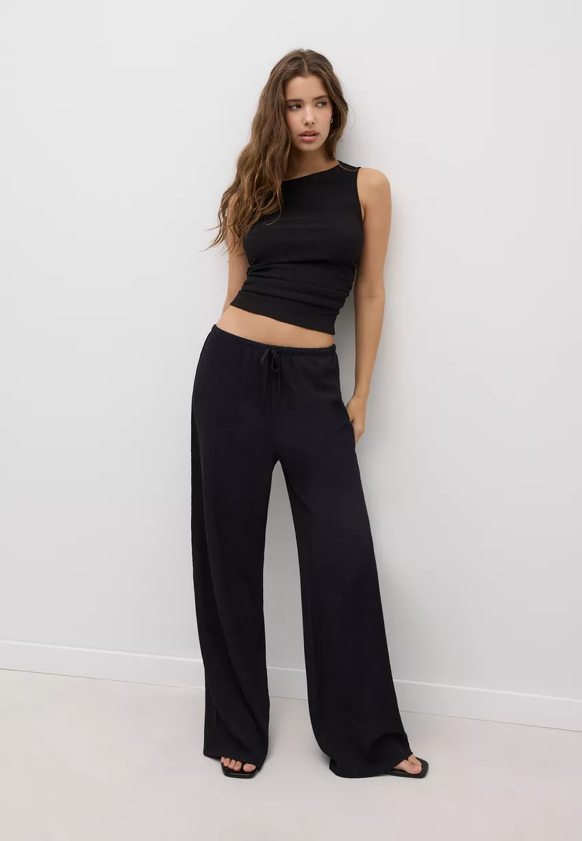 Από τη Stradivarius, οι πιο relaxed γραμμές – wide leg ή straight fit – μπορούν να λειτουργήσουν ιδανικά, αρκεί να κρατηθεί η παλέτα ουδέτερη. Beige, γκρι, μαύρο. Τίποτα που να προσπαθεί να τραβήξει την προσοχή. Γιατί στο δικό της σύμπαν, το ενδιαφέρον δεν ερχόταν από το ρούχο, αλλά από τη συνολική εικόνα.
