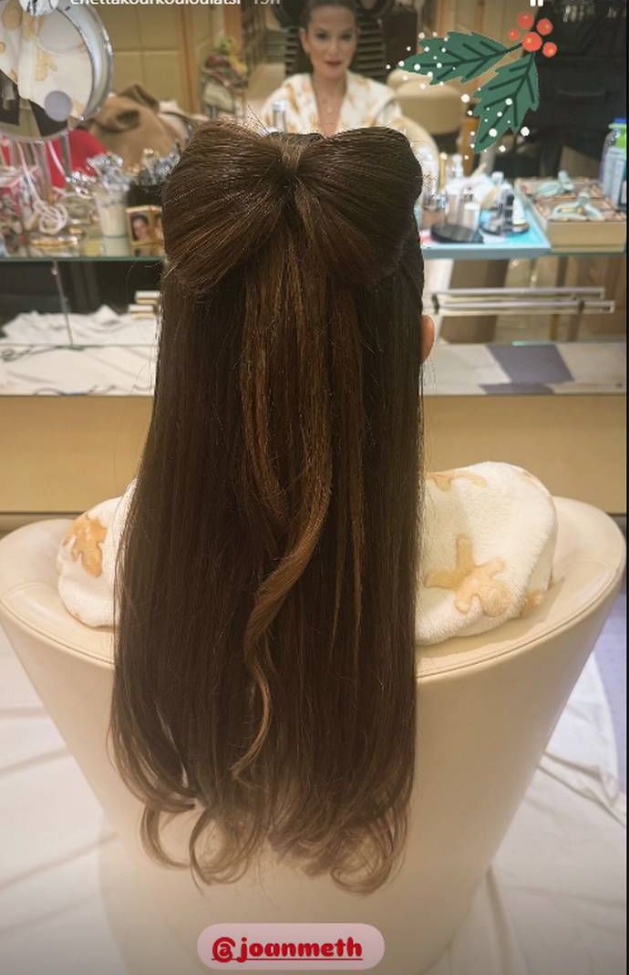 To έκανε η Εριέττα Κούρκουλου-Λάτση η οποία ανέβασε μία φωτογραφία σε ένα story στον προσωπικό της λογαριασμό στο Instagram με ένα half up half down χτένισμα και η κομμώτριά της είχε φτιάξει με τα μαλλιά της έναν χαριτωμένο φιόγκο στο πίσω μέρος του κεφαλιού της. Το αποτέλεσμα είναι ένα ρομαντικό hair look με festive διάθεση που έδινε ενδιαφέρον στην πίσω όψη του κεφαλιού.