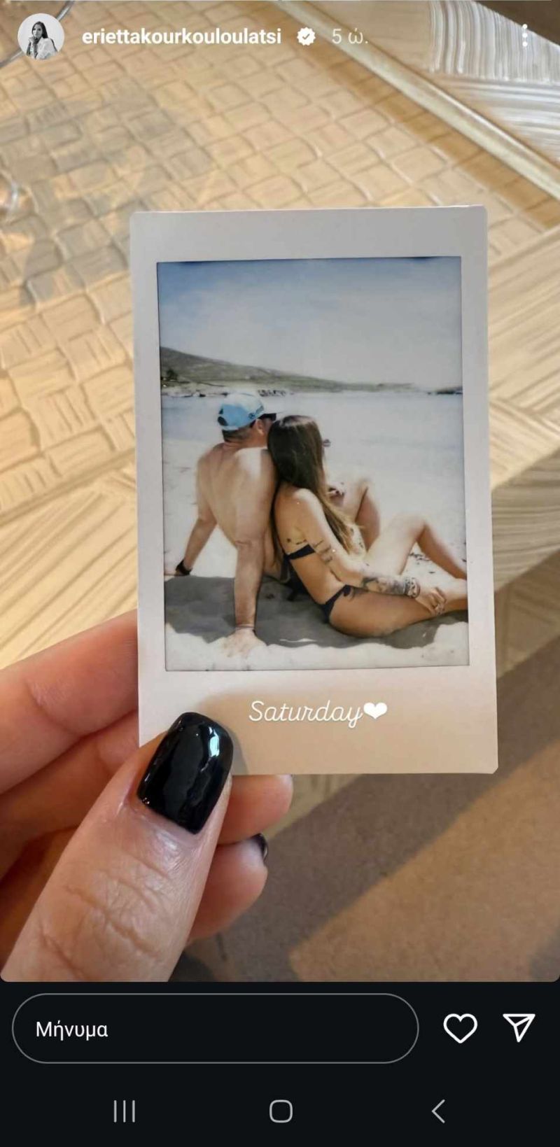 Η Εριέττα Κούρκουλου-Λάτση, ανέβασε στον προσωπικό της λογαριασμό στο Instagram το Μεγάλο Σάββατο ένα story που την έδειχνε να κρατάει μια polaroid στην οποία ποζάρει αγκαλιά με το σύζυγό της Βύρωνα Βασιλειάδη και φαίνεται πως έχει βάψει τα νύχια της μαύρα επιβεβαιώνοντας πως το συγκεκριμένο χρώμα δείχνει υπέροχο και την Άνοιξη κάνοντας ωραία αντίθεση με το λευκό δέρμα. Στην polaroid το ζευγάρι φαίνεται καθισμένο σε μια αμμουδιά φορώντας το μαγιό του κάτι που σημαίνει πως μάλλον ξεκίνησαν ήδη τα μπάνια τους για φέτος καθώς ο καιρός πλέον το επιτρέπει.