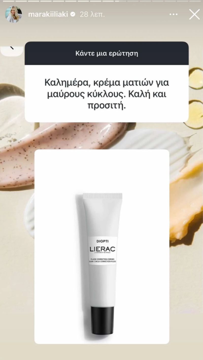 Η Μαρία Ηλιάκη ανέβασε ένα story στον προσωπικό της λογαριασμό στο Instagram και έδειξε ποια κρέμα ματιών χρησιμοποιεί απαντώντας σε ερώτηση που δέχθηκε από μία διαδικτυακή της ακόλουθο. Είπε ότι χρησιμοποιεί την Dark Circle Correction Fluid Diopti της Lierac που θα βρείτε στα ράφια των φαρμακείων και θα σβήσει τη θαμπάδα και τις σκούρες σκιές από την περιοχή φωτίζοντάς την. Η παρουσιάστρια επιβεβαίωσε το γεγονός ότι εξαφανίζει τους ανεπιθύμητους μαύρους κύκλους κάτω από τα μάτια ανανεώνοντας το βλέμμα χαρίζοντάς του τη χαμένη λάμψη γι αυτό και την προτιμά.