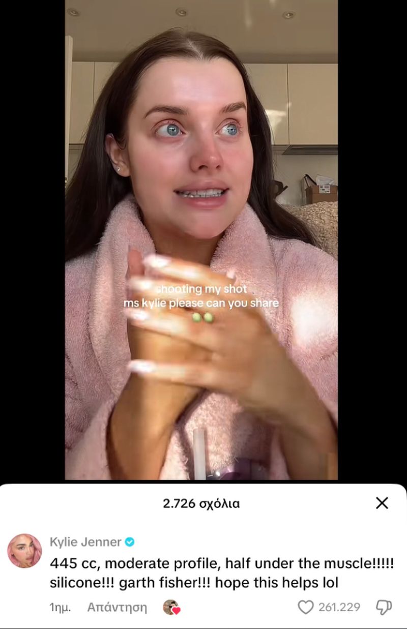 H Κylie Jenner είδε το βίντεο και απάντησε, δίνοντας στη δημοσιότητα τις πληροφορίες που ζητούσε η YouTuber, αποκαλύπτοντας μέχρι και το όνομα του γιατρού που την χειρούργησε: «445 cc, μέτριο προφίλ, το μισό [εμφύτευμα] κάτω από τον μυ!!! Σιλικόνη!!! Garth Fisher!!! Ελπίζω αυτό να βοηθήσει, χα χα».