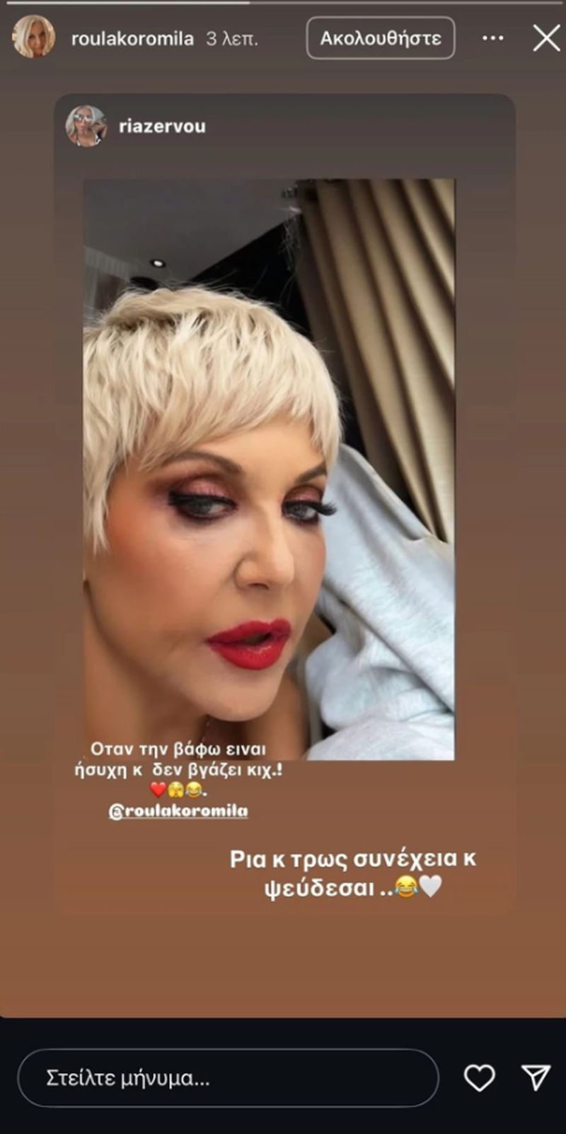Την αλλαγή είδαμε πρώτα στον λογαριασμό της make-up artist της Ρία Ζερβού στο Instagram, όπου η Ρούλα Κορομηλά ποζάρει με αψεγάδιαστο μακιγιάζ και ανανεωμένη διάθεση. Η φωτογραφία έγινε γρήγορα viral στα social media και όχι άδικα, καθώς είναι ένα κούρεμα με έντονη προσωπικότητα, που δίνει ελευθερία, κομψότητα και φρεσκάδα.