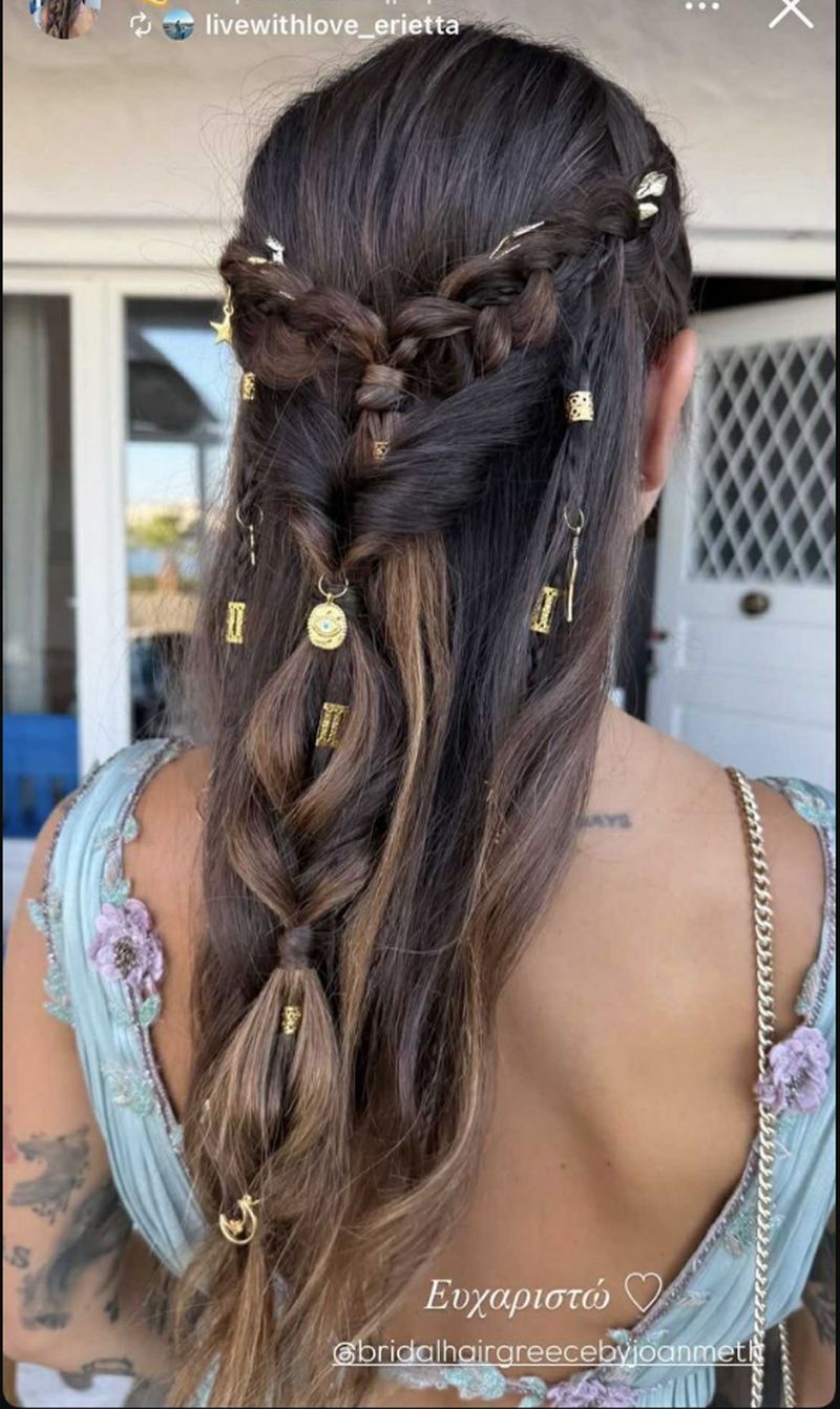 Mε τη βοήθεια λοιπόν της hairstylist Ιωάννας Μεθενίτη, επέλεξε ένα half up–half down χτένισμα με πολλές μικρές και μεγαλύτερες πλεξούδες σε όλο το μήκος των μαλλιών. Το look απογειώθηκε χάρη στα διακριτικά χρυσά αξεσουάρ που στόλιζαν τις πλεξούδες, προσθέτοντας λάμψη και κομψότητα.