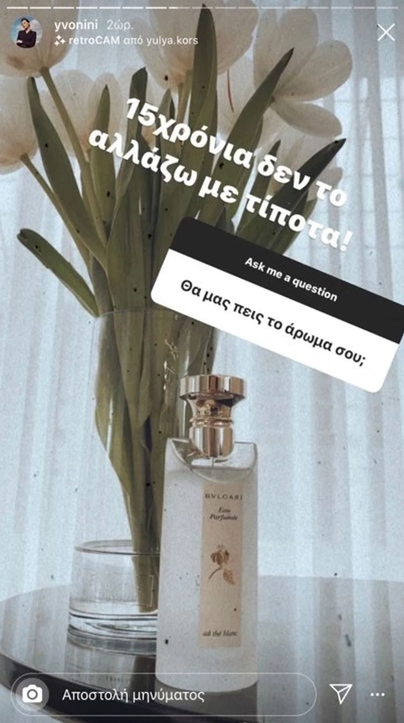 Η Υβόννη Μπόσνιακ, γνωστή για το κομψό στιλ και τη φυσική της ομορφιά, έχει ένα μυστικό που δεν αλλάζει ποτέ στην καθημερινότητά της και πρόκειται για το άρωμά της. Σε ένα Q&A που έκανε στο Instagram, αποκάλυψε ότι εδώ και 15 χρόνια φοράει αποκλειστικά το Eau Parfumée au Thé Blanc του οίκου Bvlgari. «Δεν το αλλάζω με τίποτα», έγραψε χαρακτηριστικά η σύζυγος του Αντώνη Ρέμου.