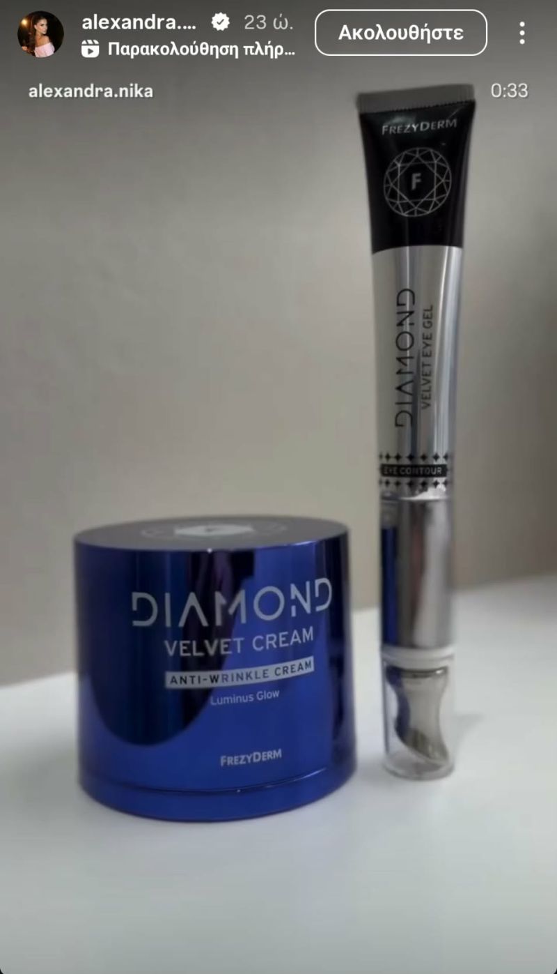 Η ίδια επιλέγει προϊόντα που λειτουργούν υβριδικά: περιποιούνται σε βάθος την επιδερμίδα και ταυτόχρονα χαρίζουν άμεση οπτική λάμψη. Ένα από αυτά είναι η Diamond Velvet Anti-Wrinkle Cream της Frezyderm.