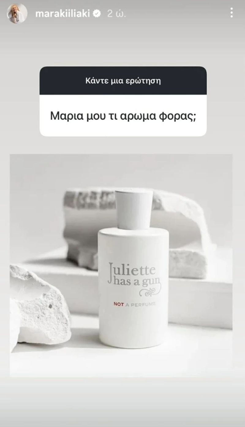 Σε ένα από τα πρόσφατα Q&A με τους διαδικτυακούς της φίλους, η Μαρία Ηλιάκη αποκάλυψε ποιο είναι το άρωμα που χρησιμοποιεί αυτή την περίοδο. Η επιλογή της είναι το Not A Perfume Eau de Parfum από τον οίκο Juliette Has A Gun. Πρόκειται για ένα άρωμα που έχει αποκτήσει μεγάλη δημοτικότητα τα τελευταία χρόνια, ιδιαίτερα ανάμεσα σε όσους προτιμούν τις καθαρές και μινιμαλιστικές αρωματικές συνθέσεις. Σε αντίθεση με τα περισσότερα αρώματα που αποτελούνται από πολλές διαφορετικές νότες, το συγκεκριμένο βασίζεται σε ένα μόνο βασικό συστατικό: το Cetalox.