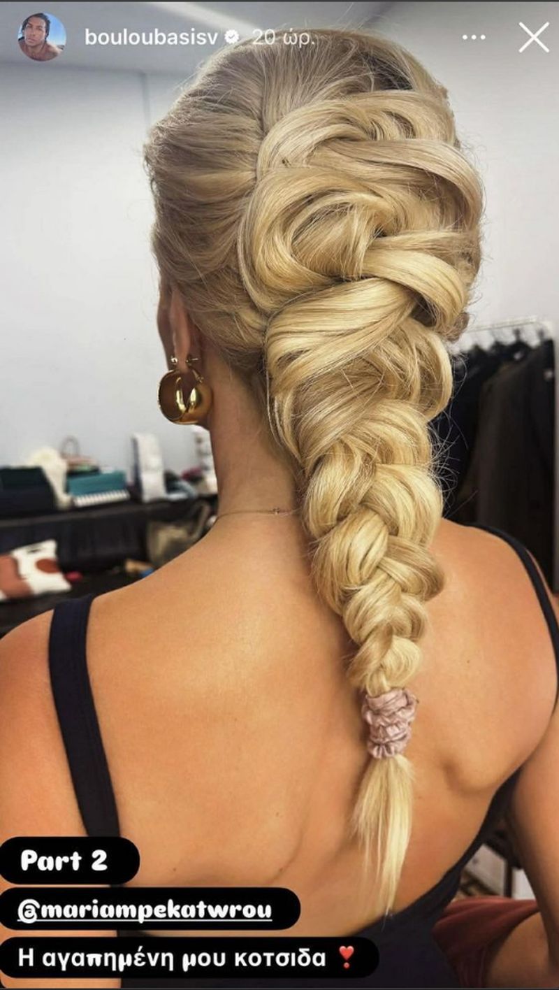 Το εντυπωσιακό αποτέλεσμα δημιούργησε ο κομμωτής της Βασίλης Μπουλούμπασης, ο οποίος μοιράστηκε τη φωτογραφία μέσα από τα stories του στο Instagram. Στην εικόνα βλέπουμε τη Μαρία Μπεκατώρου με μια μακριά και ιδιαίτερα καλοδουλεμένη γαλλική πλεξούδα, η οποία ξεκινούσε αρκετά ψηλά στο πάνω μέρος του κεφαλιού και κατέληγε σε ένα κομψό πιάσιμο στην πλάτη.
