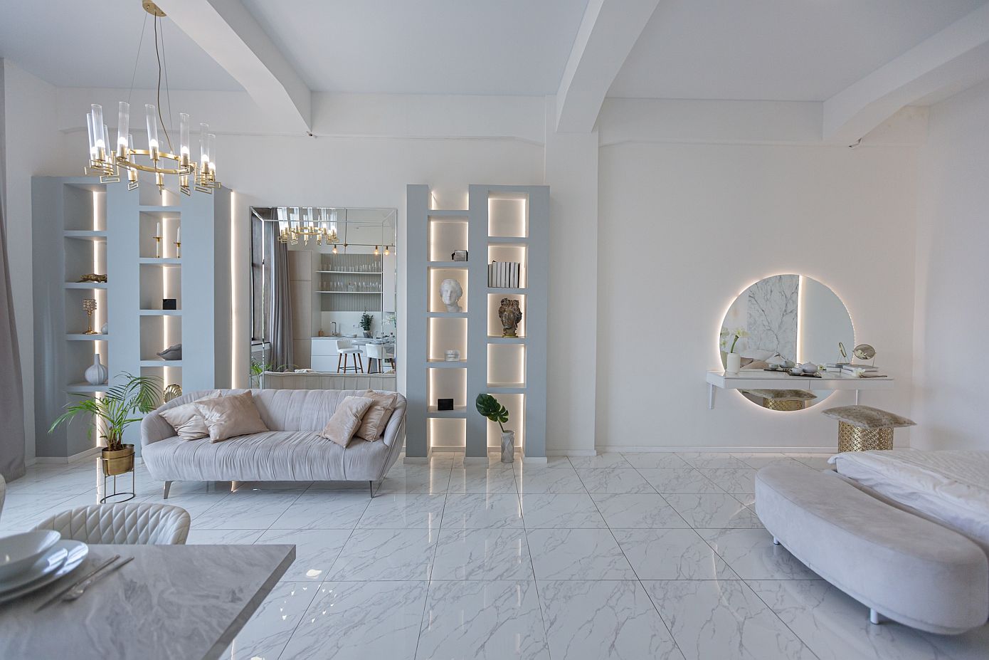 Την ίδια λογική πρέπει να ακολουθήσετε και στα ντουλάπια της κουζίνας ώστε να ψηλώσει και εκεί ο χώρος: Τοποθετήστε τα ψηλά, ενώ αν είναι τοποθετημένα χαμηλά, τοποθετήστε πάνω τους διακοσμητικά αντικείμενα για να δημιουργηθεί η ψευδαίσθηση ότι αγγίζουν το ταβάνι. Επίσης, έχετε ως αρχή πως όλες οι αποχρώσεις σε τοίχους, σοβατεπί, πάτωμα και ταβάνι πρέπει να είναι ίδιες ώστε να μπερδεύονται τα όρια του χώρου σας.