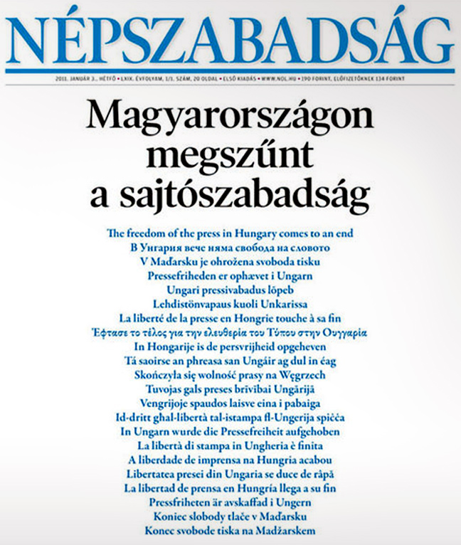 Η ουγγρική Nepszava απαιτεί στην πρώτη σελίδα την ελευθερία του Τύπου, στα ουγγρικά και τα αγγλικά, προσθέτοντας: «Οφείλουμε να υπερασπιστούμε τα δικαιώματά μας». «Ελπίζουμε ότι η Ευρώπη θα αντιληφθεί τα αντιδημοκρατικά μέτρα και θα λάβει τις δικές της συνετές, διπλωματικές αποφάσεις, αν και η μεγάλη πλειοψηφία του ουγγρικού λαού δεν αντιλαμβάνεται τίποτε».