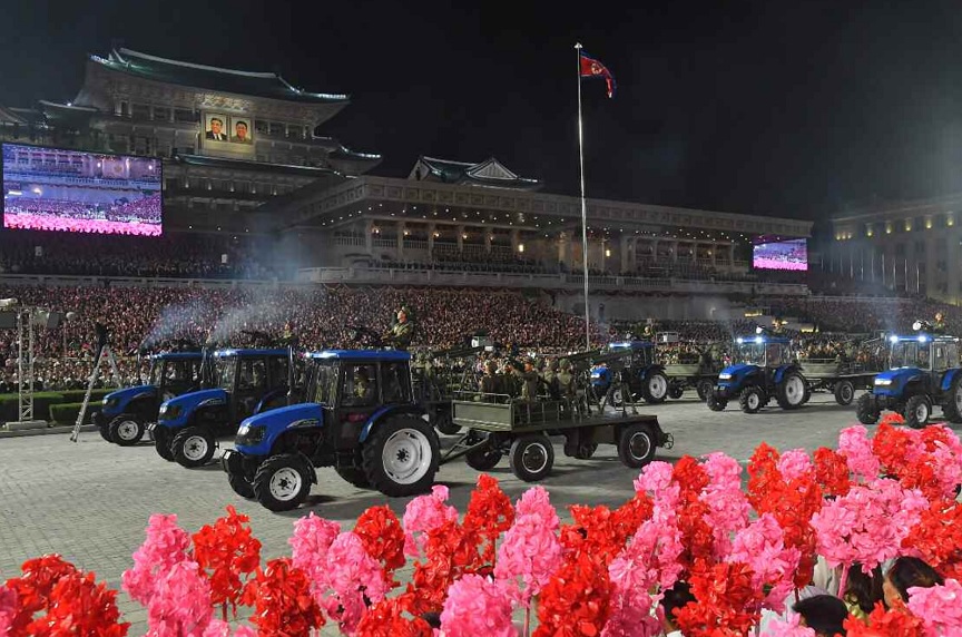 Η στρατιωτική παρέλαση πραγματοποιήθηκε στην πλατεία που φέρει το όνομα του πρώτου ηγέτη της χώρας, του Κιμ Ιλ Σουνγκ (παππού του Κιμ Γιονγκ Ουν). Στο πλάι του Κιμ Γιονγκ Ουν ήταν και η κόρη του Κιμ Γιου Αε. Στην παρέλαση, που έγινε νύχτα στους δρόμους της Πιονγκγιάνγκ δεν βγήκε όλος στρατιωτικός εξοπλισμός – σύμφωνα με τον εξειδικευμένο ιστοτόπο NKNEWS αυτό αναμένεται να γίνει σε άλλη στιγμή – αλλά τρακτέρ με οπλισμένους πολιτοφύλακες, κάποια ρουκετοβόλα, τάγματα μοτοσικλετιστών του στρατού και οπλισμένοι φοιτητές. Τα οχήματα, δε, να σημειώσουμε πως αν και πολιτικά έχουν υποστεί «στρατιωτικές» μετατροπές ώστε να είναι επιχειρησιακά σε περίπτωση ανάγκης.