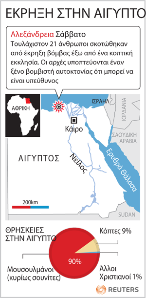 Το πολύνεκρο βομβιστικό χτύπημα σε κοπτική εκκλησία της Αλεξάνδρειας στην Αίγυπτο είχε τραγικό απολογισμό το θάνατο 21 ανθρώπων και τον τραυματισμό 97.