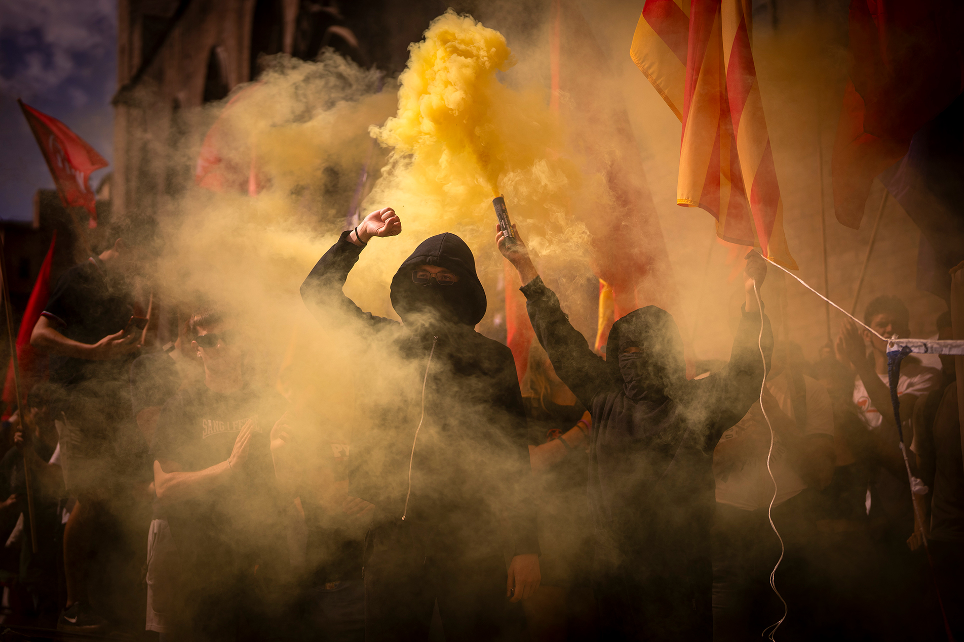 Διαδηλωτές υπέρ της ανεξαρτησίας της Καταλονίας, καίνε σημαίες, καθώς φωνάζουν συνθήματα που ζητούν την ανεξαρτησία της Καταλονίας από την Ισπανία, κατά τη διάρκεια της Εθνικής Ημέρας της Καταλονίας στη Βαρκελώνη. Η παραδοσιακή 11η Σεπτεμβρίου, που ονομάζεται «Diada», σηματοδοτεί την πτώση της καταλανικής πρωτεύουσας από τις ισπανικές δυνάμεις το 1714.