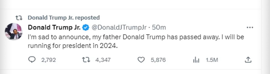 «Με λύπη μου ανακοινώνω ότι ο πατέρας μου Ντόναλντ Τραμπ απεβίωσε. Θα είμαι υποψήφιος για την προεδρία το 2024», έγραφε μήνυμα ενώ σε άλλο ανέφερε ότι η Βόρεια Κορέα «θα γίνει καπνιστή».