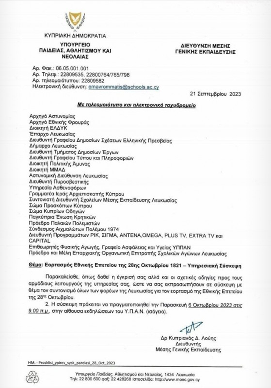 Το υπουργείο Παιδείας της Κύπρου, φαίνεται να μπέρδεψε τις εθνικές επετείου. Με αφορμή τις προετοιμασίες για τον εορτασμό της 28ης Οκτωβρίου, το υπουργείο απέστειλε σχετική εγκύκλιο στο τέλος της οποίας αναφερόταν στην επέτειο μόνο που αντί για 1940 έγραφε 1821, δηλαδή τη χρονολογία της ελληνικής επανάστασης της 25ης Μαρτίου, σύμφωνα με το τοπικό sigmalive.
