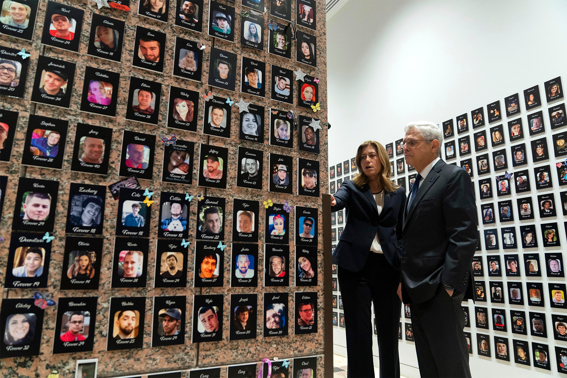 Ο Γενικός Εισαγγελέας Merrick Garland συνοδευόμενος από τη Διοικήτρια της Υπηρεσίας Επιβολής Ναρκωτικών των ΗΠΑ Anne Milgram, κοιτάζει φωτογραφίες χιλιάδες ανθρώπων που πέθαναν από ναρκωτικά κατά τη διάρκεια της Δεύτερης Ετήσιας Οικογενειακής Συνόδου Κορυφής για τη Φαιντανύλη στα κεντρικά γραφεία της DEA στην Ουάσινγκτον. Ορισμένες πολιτείες των ΗΠΑ έχουν σοβαρό πρόβλημα, ειδικότερα με τον εθισμό στη φαιντανύλη. «Εμπνέομαι κάθε μέρα από τις οικογένειες που μετέτρεψαν τη θλίψη και τον πόνο τους σε δράση, δουλεύοντας ακούραστα για να αποτρέψουν άλλες οικογένειες να υποστούν την αδιανόητη απώλεια ενός αγαπημένου τους προσώπου από ναρκωτικά», είπε η Milgram.