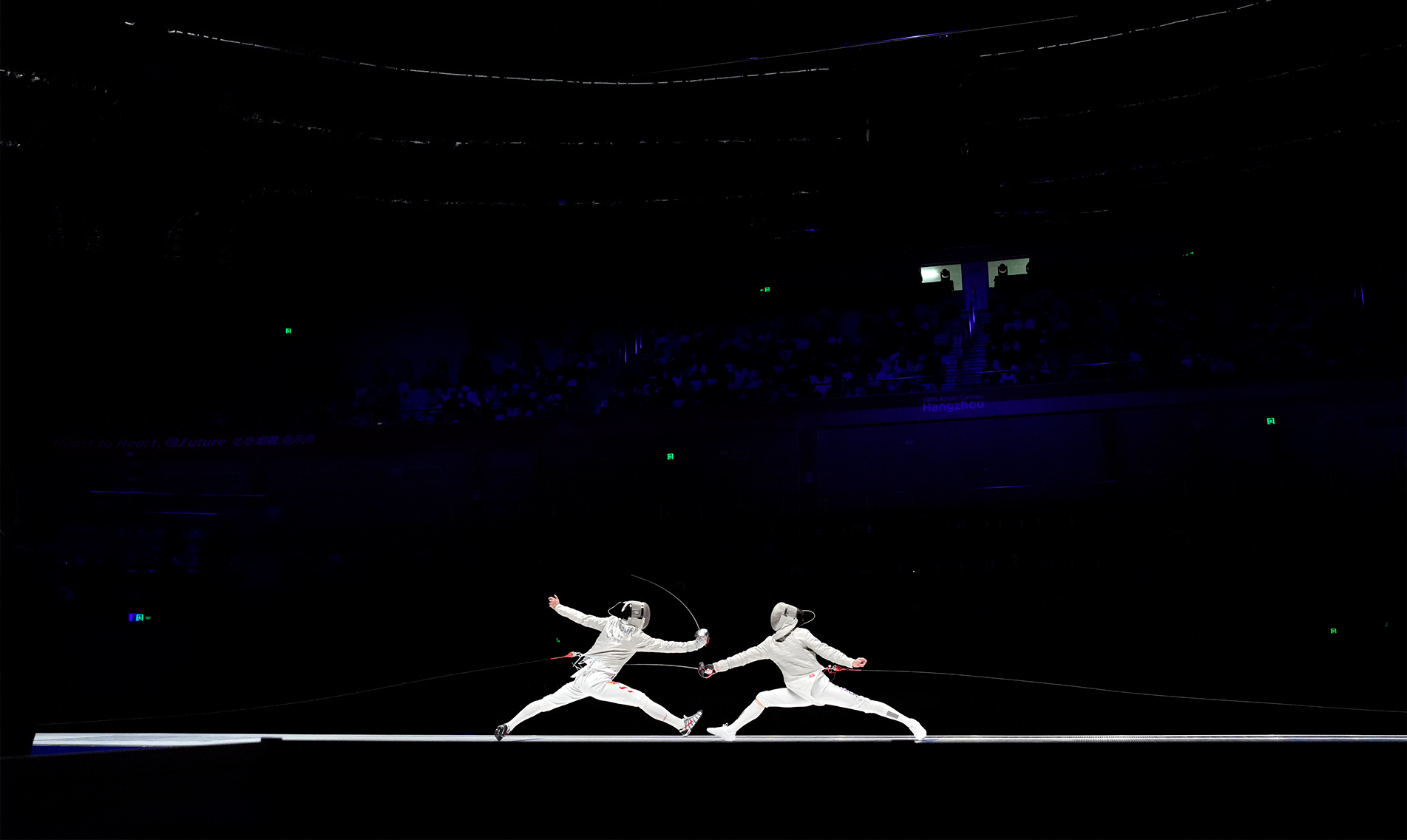 Οι 19οι Ασιατικοί Αγώνες στο Hangzhou συνεχίζονται. Στη φωτογραφία φαίνεται ο αγώνας ξιφασκίας ανάμεσα στον Κινέζο Liang Jianhao, που αγωνίζεται εναντίον του Νοτιοκορεάτη Kim Junho κατά τη διάρκεια του ομαδικού τελικού ξιφασκίας σπάθης ανδρών. Ο Kim Junho της Νότιας Κορέας νίκησε τον Liang Jianhao της Κίνας και έτσι έληξε ένας ακόμα εντυπωσιακός αγώνας.