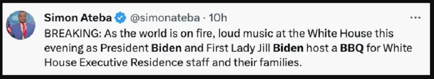 Επίσης, ο δημοσιογράφος Simon Ateba, που εργάζεται για τον Λευκό Οίκο, επιβεβαίωσε την είδηση και έκανε ανάρτηση στο Χ, γράφοντας πως «την ώρα που ο κόσμος καίγεται, ακούγεται δυνατή μουσική από τον Λευκό Οίκο, όπου ο Τζο Μπάιντεν και η πρώτη κυρία Τζιλ Μπάιντεν απολαμβάνουν μπάρμπεκιου με καλεσμένους το προσωπικό τους και τις οικογένειες τους», έγραψε χαρακτηριστικά στην ανάρτηση.