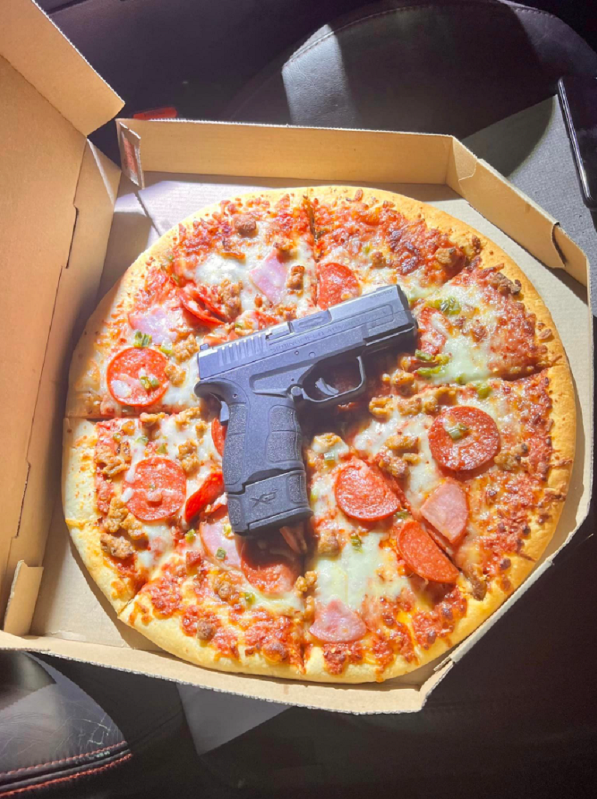 Τότε, οι αστυνομικοί σταμάτησαν το αμάξι του 47χρονου Danny Carson, που βρίσκεται σε κοινοτική επίβλεψη, επειδή έχει παραβιάσει νομοθεσίες που αφορούν την οπλοκατοχή. «Οι αστυνομικοί εντόπισαν ένα πριονισμένο κυνηγετικό όπλο και δύο γεμάτα πιστόλια, το ένα από τα οποία ήταν κρυμμένο σε ένα κουτί πίτσας πάνω από την πίτσα», ανέφερε το γραφείο του σερίφη.