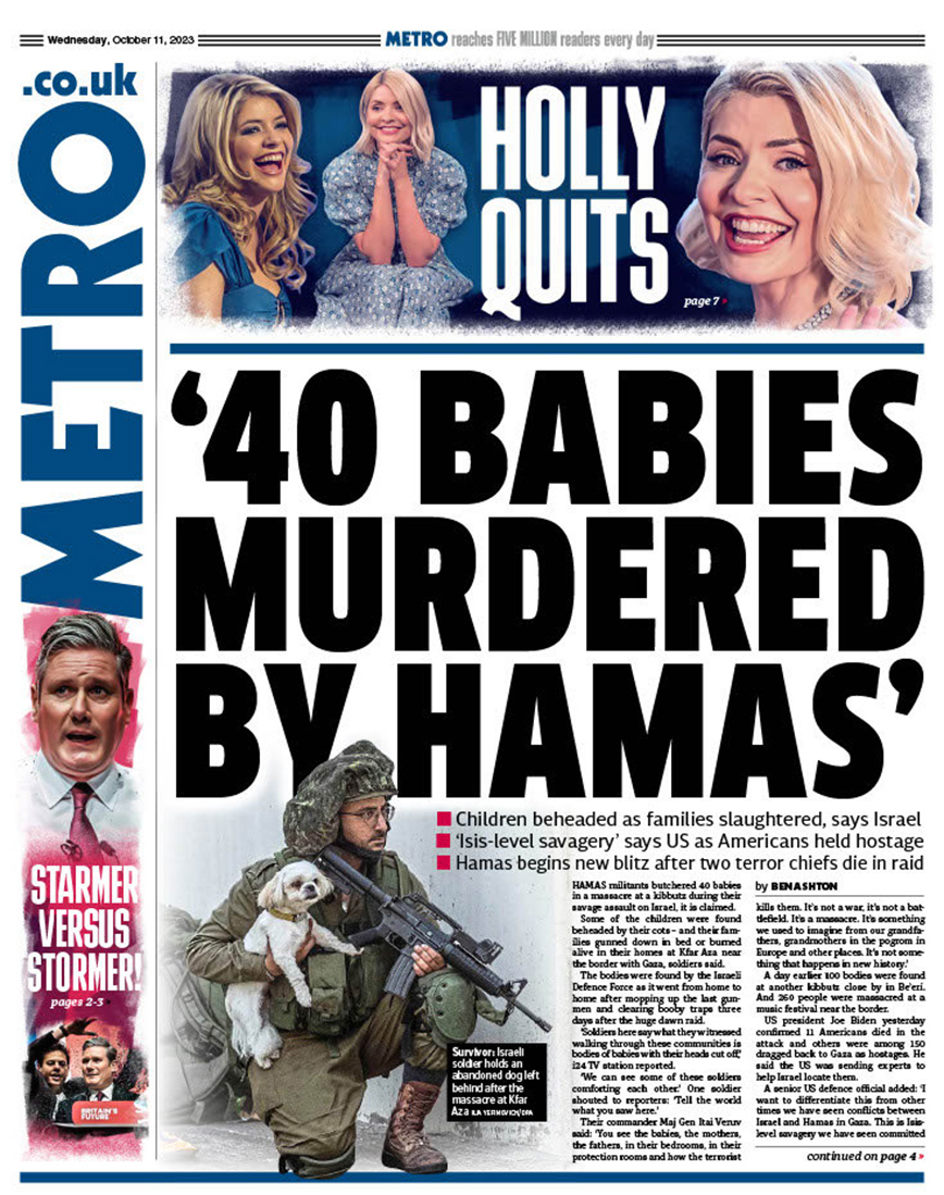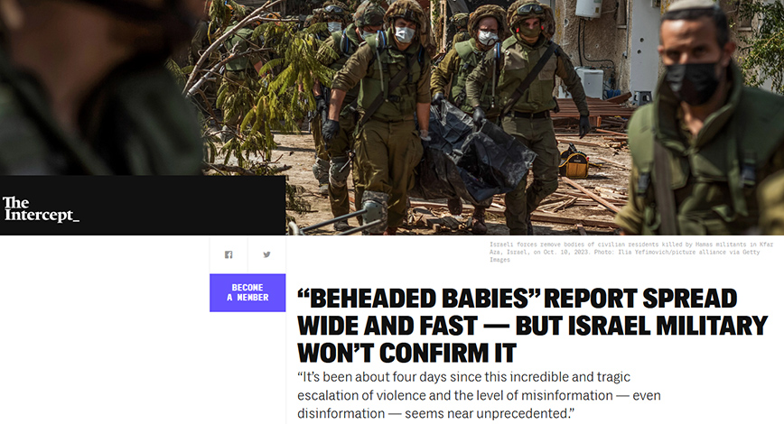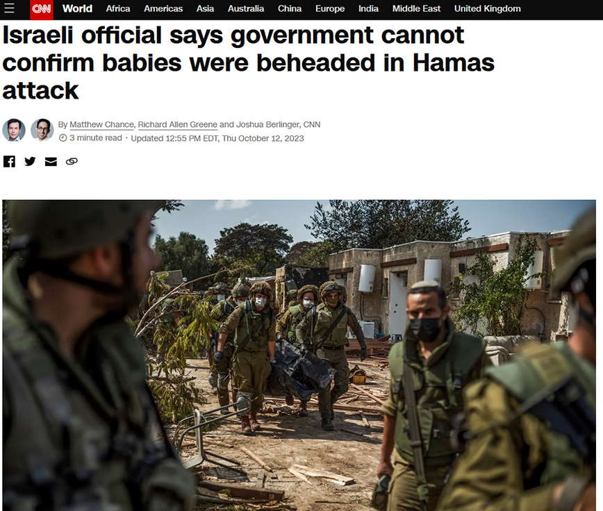 Στις 11 Οκτωβρίου πολλά δυτικά μέσα αναπαρήγαγαν την «είδηση» επικαλούμενα τον εκπρόσωπο του Ισραηλινού πρωθυπουργού, σύμφωνα με τον οποίο «μωρά και βρέφη βρέθηκαν αποκεφαλισμένα στο Kfar Aza».