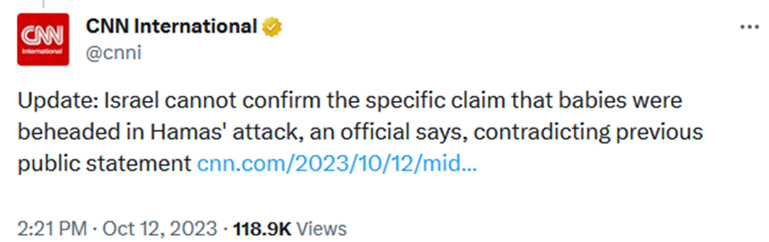 Στις 12 Οκτωβρίου, η παρουσιάστρια του CNN Sara Sidner που είχε αναμεταδώσει την πληροφορία για τα αποκεφαλισμένα μωρά, σε tweet της ζήτησε συγγνώμη λέγοντας: «Χθες, το γραφείο του Ισραηλινού πρωθυπουργού είπε ότι επιβεβαίωσε ότι η Χαμάς αποκεφάλισε μωρά και παιδιά ενώ ήμασταν ζωντανά στον αέρα. Η ισραηλινή κυβέρνηση λέει σήμερα ότι ΔΕΝ ΜΠΟΡΕΙ να επιβεβαιώσει ότι αποκεφαλίστηκαν μωρά. Έπρεπε να είμαι πιο προσεκτική με τα λόγια μου και λυπάμαι γι’ αυτό».