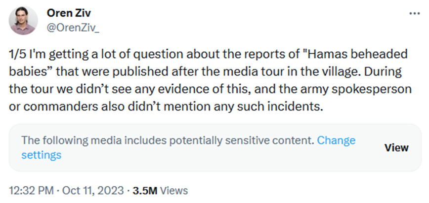 Αλλά και ο Oren Zif δημοσιογράφος και φωτορεπόρτερ του 972mag έγραψε στο X: «Έχω πολλές ερωτήσεις σχετικά με τις αναφορές για “αποκεφαλισμένα μωρά της Χαμάς” που δημοσιεύτηκαν μετά την περιοδεία των μέσων ενημέρωσης στο χωριό. Κατά τη διάρκεια της περιοδείας δεν είδαμε κανένα στοιχείο γι’ αυτό, ούτε ο εκπρόσωπος του στρατού ούτε οι διοικητές ανέφεραν τέτοια περιστατικά», ενώ σε νεότερη ανάρτησή του διευκρίνιζε: «Τις τελευταίες μέρες, αυτό το νήμα χρησιμοποιήθηκε για να ισχυριστούν, ψευδώς, ότι η Χαμάς δεν δολοφόνησε παιδιά. Θα ήθελα να καταστήσω σαφές, όπως είπα και πριν: η Χαμάς αναμφίβολα δολοφόνησε αμάχους, συμπεριλαμβανομένων παιδιών. Η μόνη ερώτηση αφορούσε τις λεπτομέρειες αυτών των φρικτών πράξεων.