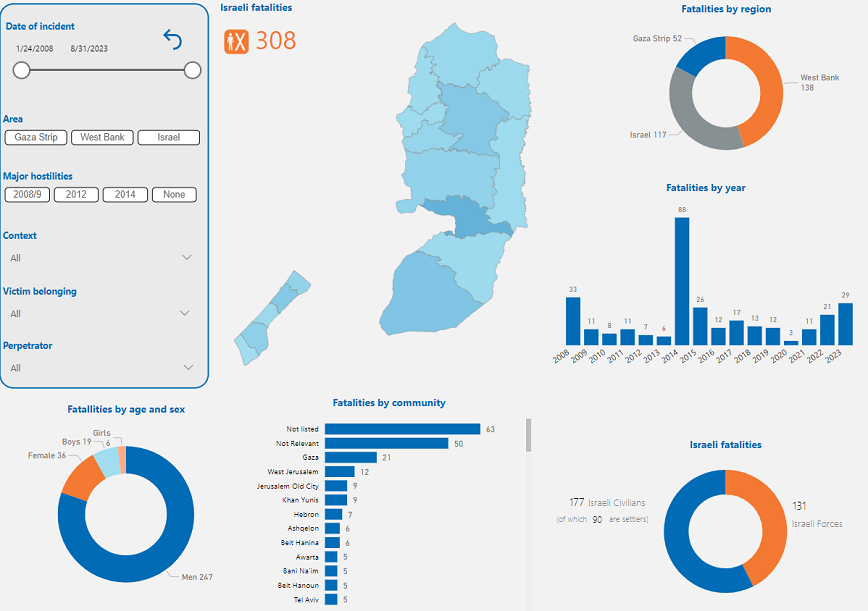 Αντιθέτως, το Ισραήλ έχει χάσει 308 άτομα σε 15 χρόνια, με τους 131 να είναι στρατιώτες, οι 90 έποικοι σε παλαιστινιακά εδάφη και οι υπόλοιποι πολίτες που σκοτώθηκαν στην επικράτεια του Ισραήλ.
