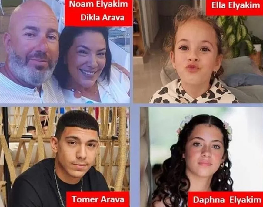 Η οικογένεια – ο Noam Elyakim, η σύντροφός του Dikla Arava, ο 17χρονος γιος της Tomer και οι δύο κόρες του Noam, η Daphna, 15 ετών, και η Ella, 8 ετών – φαίνεται να κρατούνται στο σπίτι τους από τους δράστες. Τα κορίτσια, που ζουν με τη μητέρα τους, πιστεύεται ότι επισκέφθηκαν τον πατέρα τους για να γιορτάσουν την 70ή επέτειο του κιμπούτς.