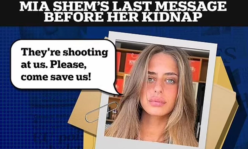 Μια κοπέλα που η Χαμάς απήγαγε από το μουσικό φεστιβάλ και έδωσαν στη δημοσιότητα βίντεο που τους δείχνει να φροντίζουν τα τραύματα της είχε στείλει μήνυμα σε φίλη της ζητώντας βοήθεια. «Μας πυροβολούν. Σας παρακαλώ, ελάτε να μας σώσετε». Η Χαμάς λίγες μέρες αργότερα έδωσε στη δημοσιότητα πλάνα της Mia να παρακαλεί τους Ισραηλινούς αξιωματούχους να «την πάρουν από τη Γάζα».