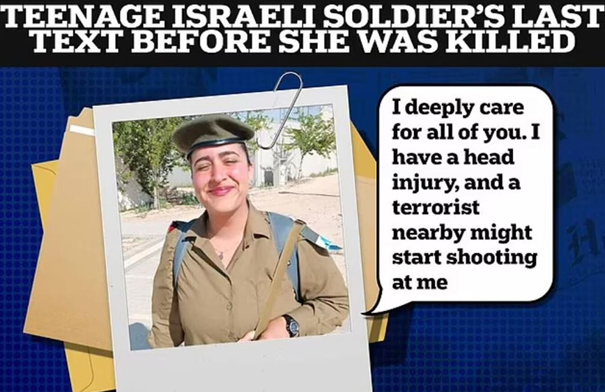 «Υπάρχει τρομοκράτης εδώ που δεν λέει να φύγει. Ακούω κάποιον να ουρλιάζει και φαίνεται ότι υπάρχει θύμα», έγραψε. Η θεία της, Shmirit Ilook, δήλωσε στο Ynet ότι η ανιψιά της ήταν τοποθετημένη στην είσοδο όταν μπήκαν οι ένοπλοι. «Γύρω στις 7.30 π.μ., εξακολουθούσε να μας στέλνει μηνύματα για τους τρομοκράτες που την πυροβολούσαν, αλλά μετά σταμάτησε να στέλνει» είπε η θεία.
