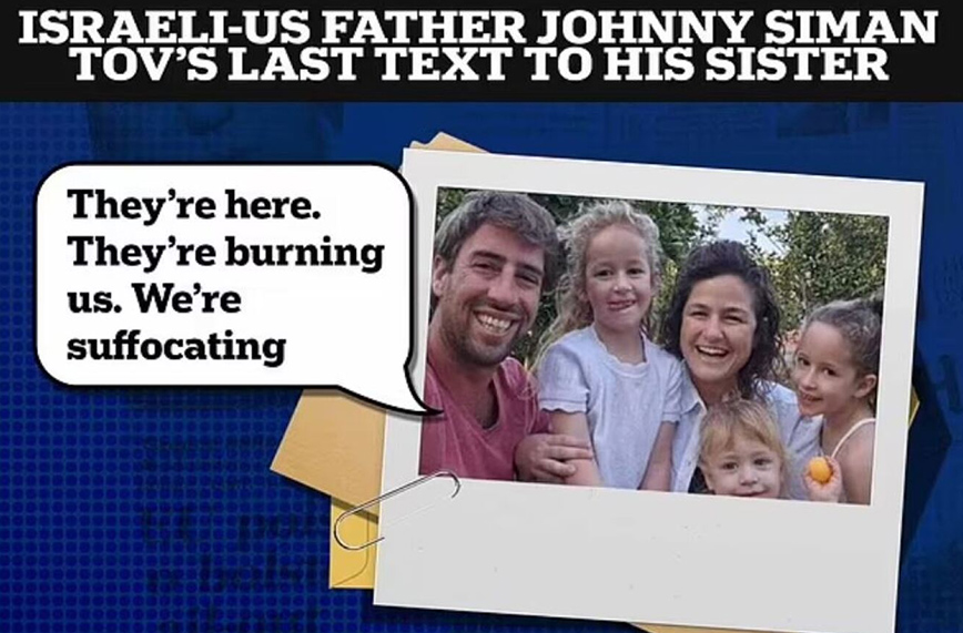 Μια ισραηλινοαμερικανική οικογένεια που δέχτηκε επίθεση από άντρες της Χαμάς στις 7 Οκτωβρίου έστειλε μήνυμα στους συγγενείς της για να τους πει ότι είχαν φτάσει με ασφάλεια σε καταφύγιο – αλλά στη συνέχεια έστειλε μηνύματα ότι τους είχαν βρει και πως θα τους σκότωναν. Η οικογένεια ξεκληρίστηκε μετά την απίθστευτη αγριότητα των αντρών της Χαμάς που τους έκαψε ζωντανούς ενώ σκότωσε ακόμα και το σκυλί της οικογένειας.