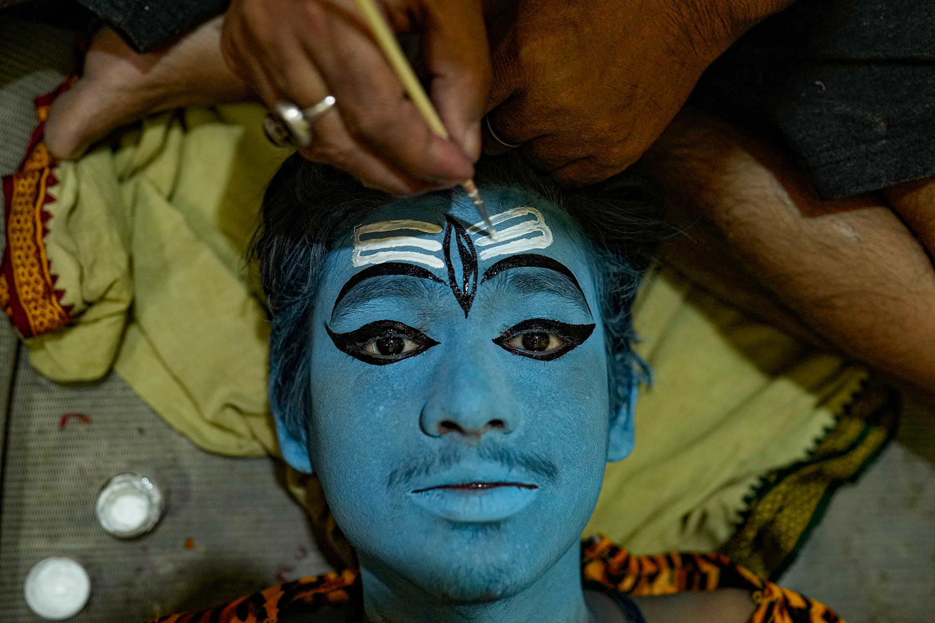 Ένα εντελώς διαφορετικό βλέμμα, μια εντελώς διαφορετική σκηνή. Ένας καλλιτέχνης προετοιμάζεται για μια θρησκευτική πομπή κατά τη διάρκεια του φεστιβάλ Dussehra στο Prayagraj της Ινδίας. Το φεστιβάλ Dussehra τιμά τη νίκη του Ράμα επί του Ραβάνα, ενός δαίμονα βασιλιά που είχε απαγάγει τη γυναίκα του Ράμα. Ο Ράμα σκότωσε τον Ραβάνα για να απελευθερώσει τη Σίτα.
