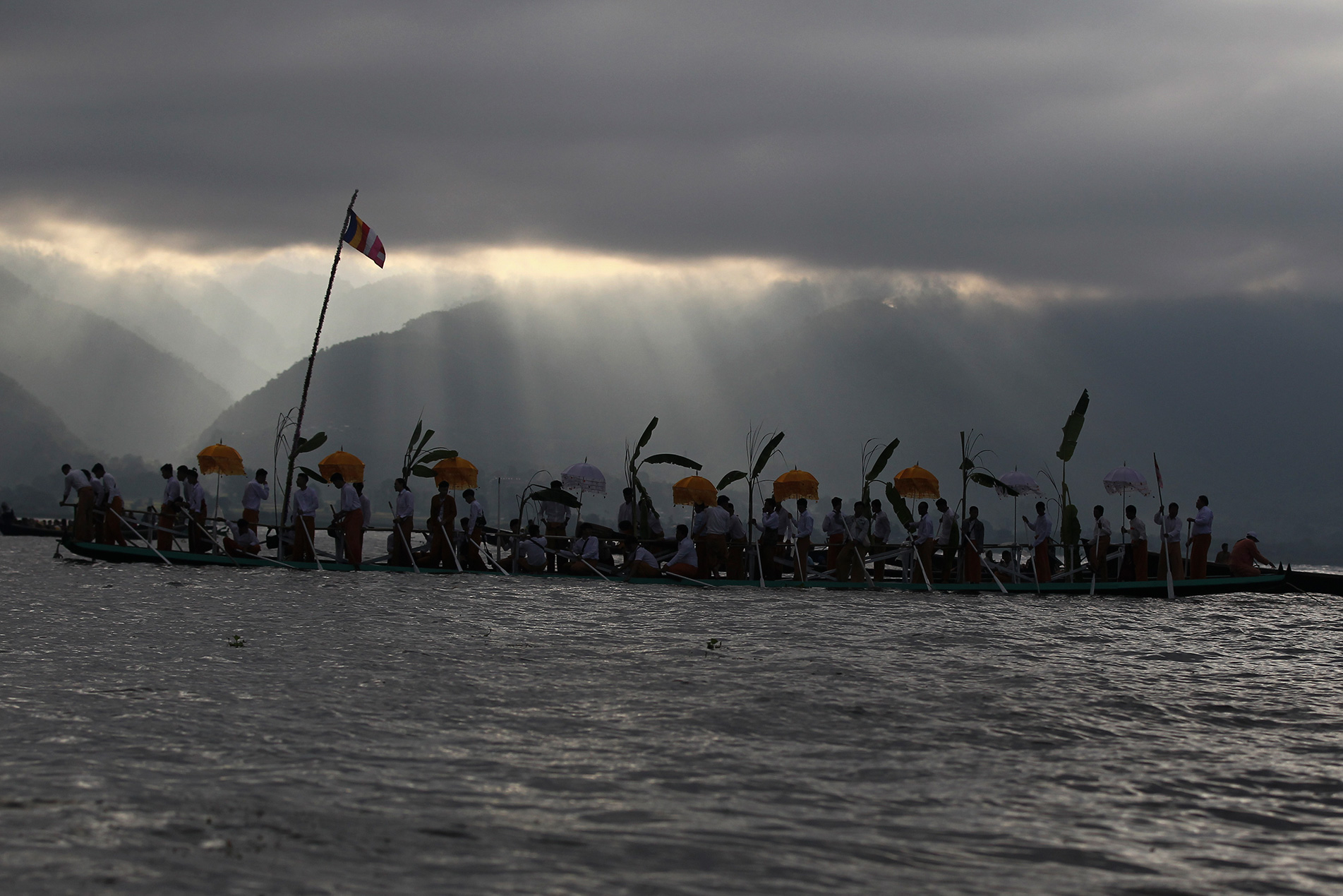 Η εθνοτική ομάδα Inntha κωπηλατεί με μια μακριά βάρκα σε μια πομπή που μεταφέρει εικόνες του Βούδα σε ένα μοναστήρι κατά τη διάρκεια του φεστιβάλ παγόδας στη λίμνη Inlay, στη νότια πολιτεία Shan της Μιανμάρ. Οι γιορτές παγόδων γίνονται σε όλη τη χώρα και τιμούν σημαντικά θρησκευτικά γεγονότα στην ιστορία της παγόδας, συμπεριλαμβανομένης της ίδρυσης μιας παγόδας και της στέψης του hti της παγόδας. Τα φεστιβάλ παγόδων υπαγορεύονται από το θρησκευτικό ημερολόγιο της Βιρμανίας και συχνά πραγματοποιούνται αρκετές ημέρες κάθε φορά.