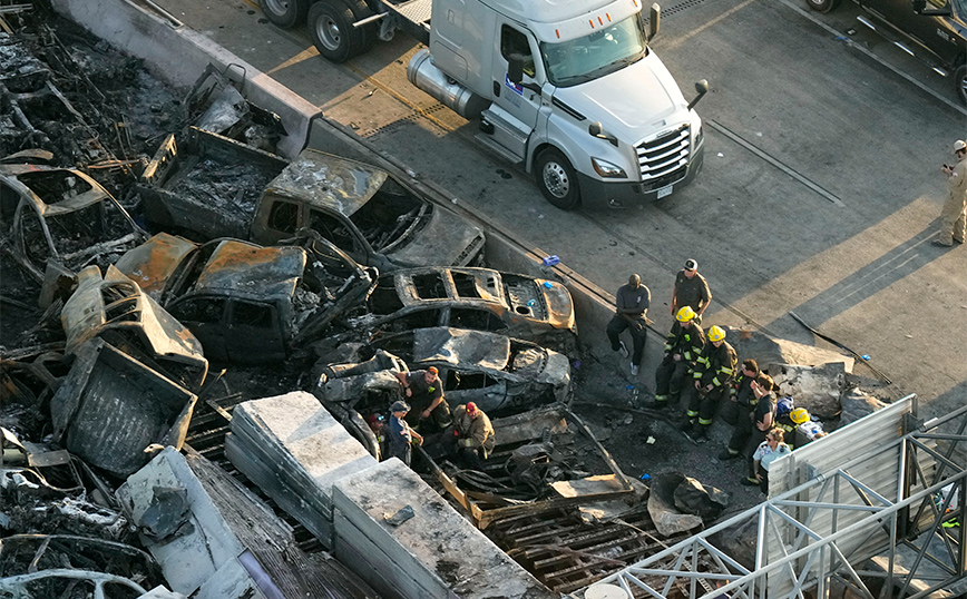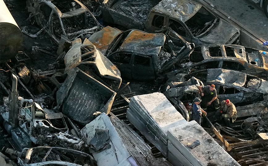 Σωροί από παραμορφωμένα αυτοκίνητα, στοιβαγμένα το ένα πάνω στο άλλο καθώς οι πυροσβέστες έσκαβαν μέσα στα συντρίμμια, παρέμεναν στον αυτοκινητόδρομο καθώς έδυε ο ήλιος.